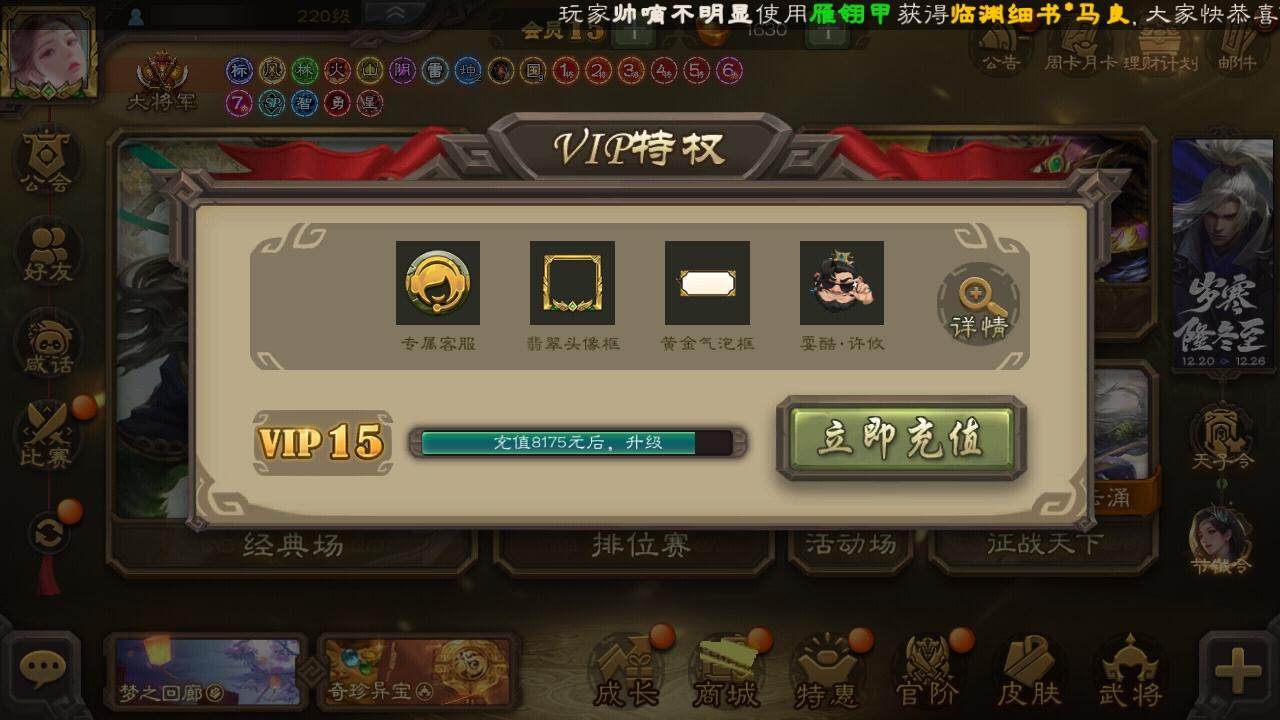 官阶:大将军;VIP等级:VIP15;史诗武将数量:76;动态皮肤数量:72