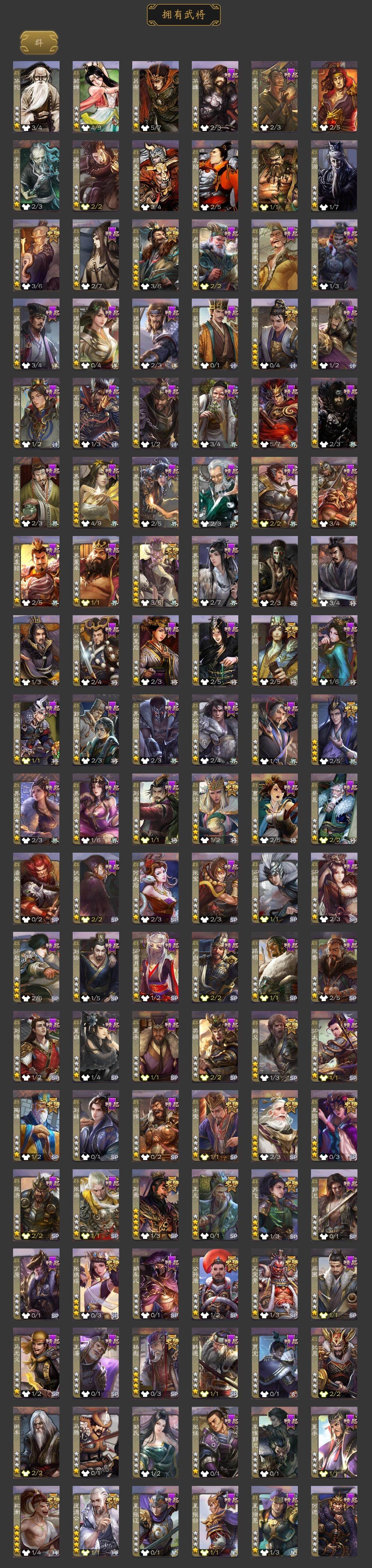 神曹操,神吕布,神赵云,神司马懿,神陆逊,神刘备,神甘宁,神张辽,神郭嘉,神太史慈,神孙策,神荀彧,神关羽,神吕蒙,神周瑜,神诸葛亮,SP司马昭,王粲,杨修,文鸯,王元姬,王朗,司马师,马钧,界钟会,界于禁,界曹真,嵇康,郝昭,陈琳,曹婴,曹纯,戏志才,刘晔,关索,马云騄,谋黄