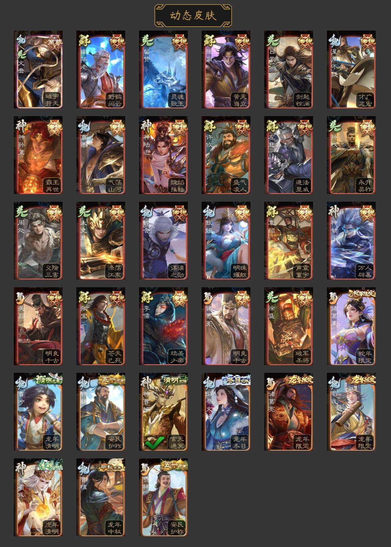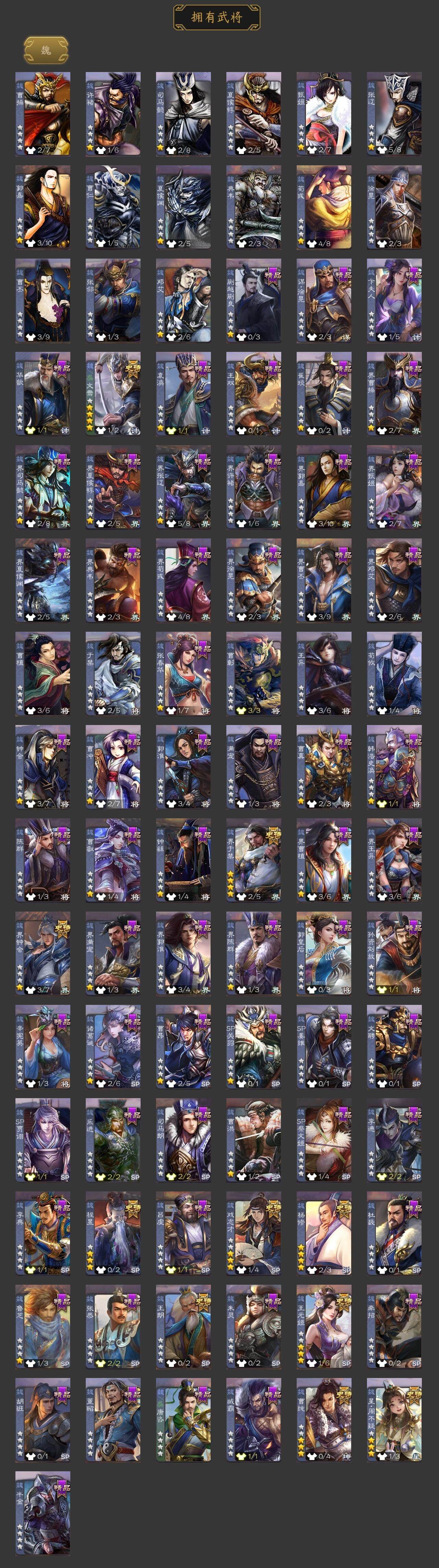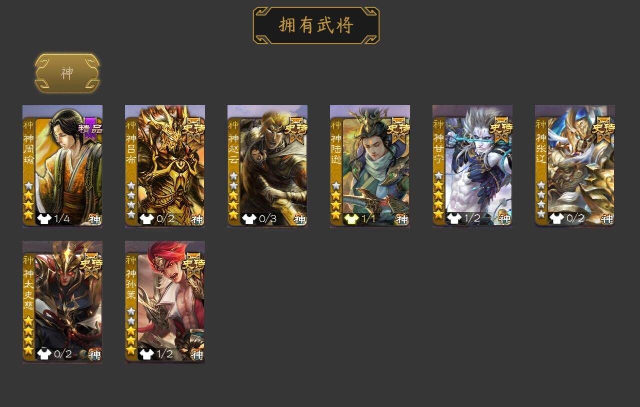 神吕布,神赵云,神陆逊,神甘宁,神张辽,神太史慈,神孙策,星周不疑,杨修,王元姬,王朗,界钟会,界于禁,曹纯,戏志才,程昱,谋诸葛亮,谋赵云,赵襄,王平,沙摩柯,谯周,花鬘,董允,谋黄盖,周处,留赞,界朱然,界徐盛,文鸯,十常侍,裴秀,皇甫嵩,左慈,郑玄,张让,麹义,南华老仙,刘焉