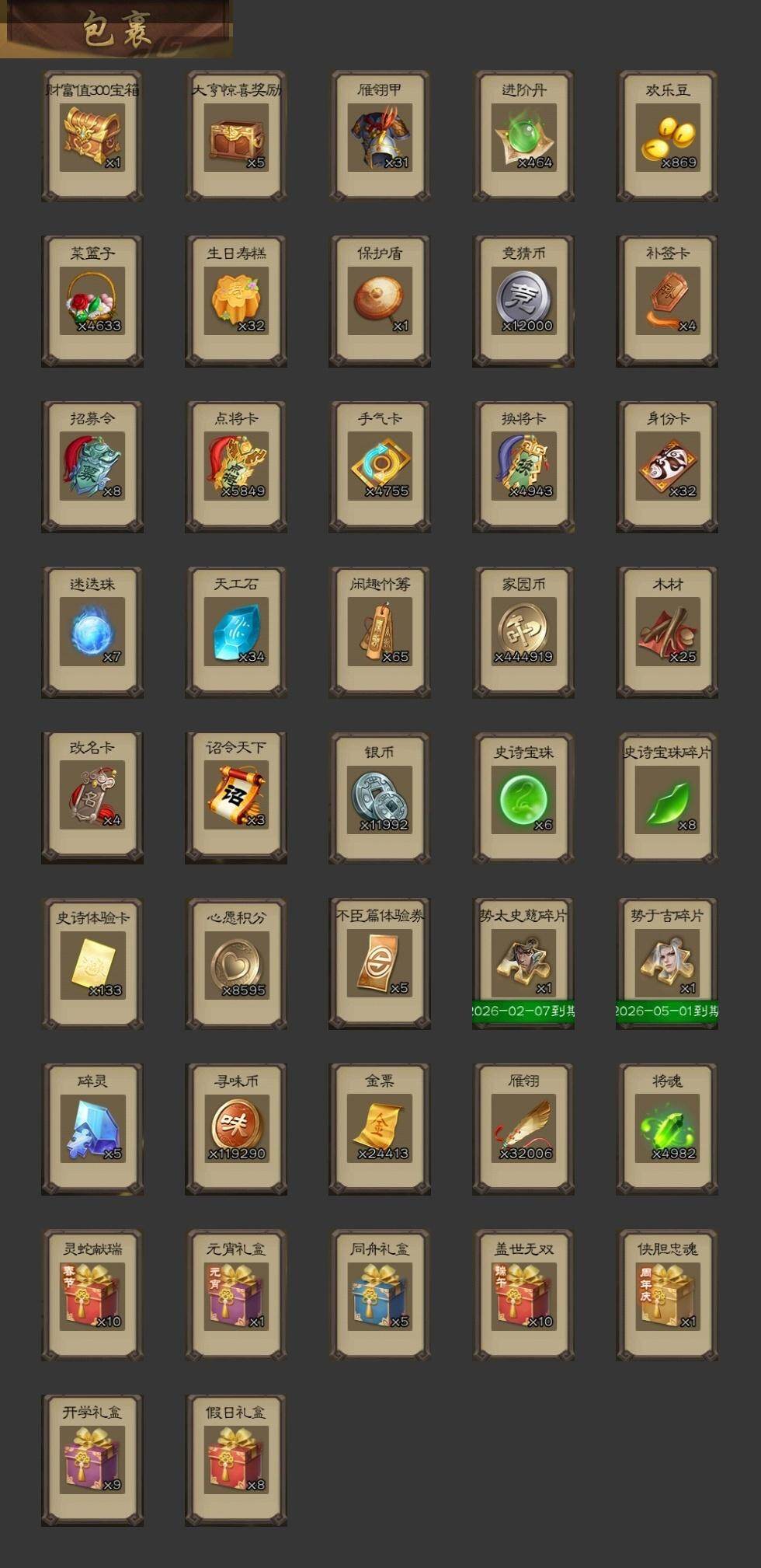 官阶:大将军;VIP等级:VIP11;史诗武将数量:46;动态皮肤数量:30;武将总数:374;史诗宝珠数量:6;将魂数量:4982;神将:7;魏国史诗武将:18;蜀国史诗武将:8;吴国史诗武将:7;群史诗武将:16