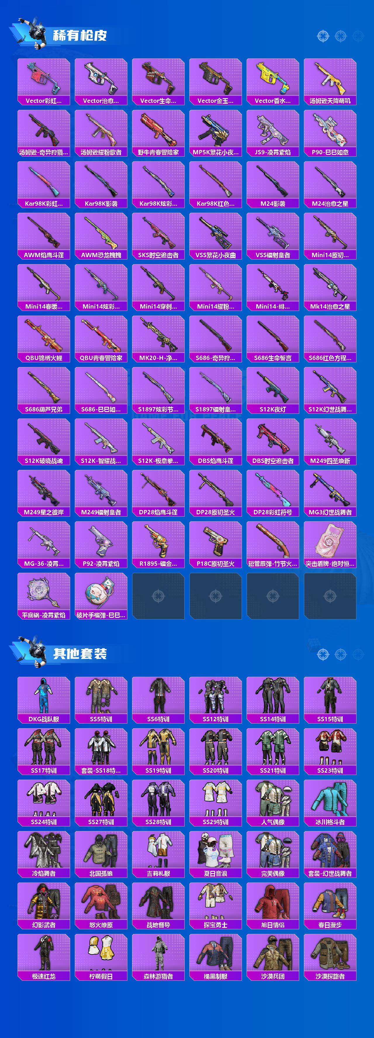 【粉色枪皮等级】:M416-电玩时刻(五级),AUG-暖羊咩咩(五级),Kar98K-创世·救赎(五级),Kar98K-巳巳如意(五级),DP-28-豹影疾电(五级)