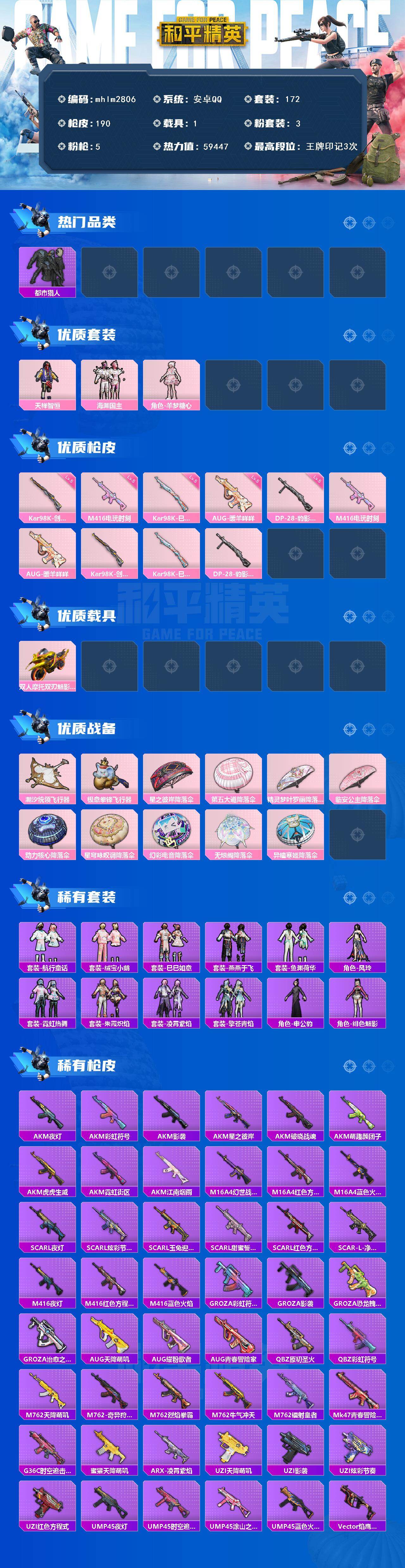 安卓 手Q-3粉装-5特效枪-1载具-4粉色飞行器-59447热力值-3王牌印记-172套装-190枪皮