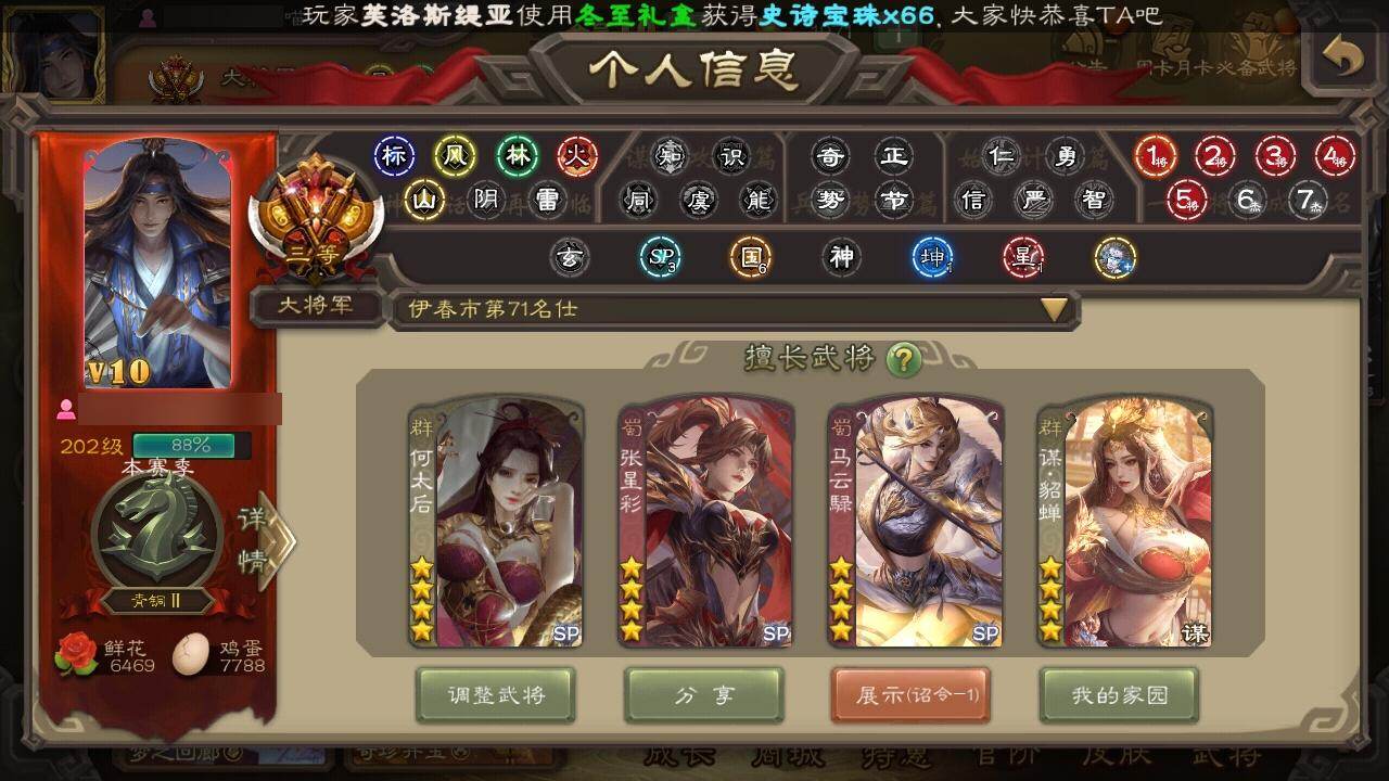 官阶:大将军;VIP等级:VIP10;史诗武将数量:44;动态皮肤数量:38