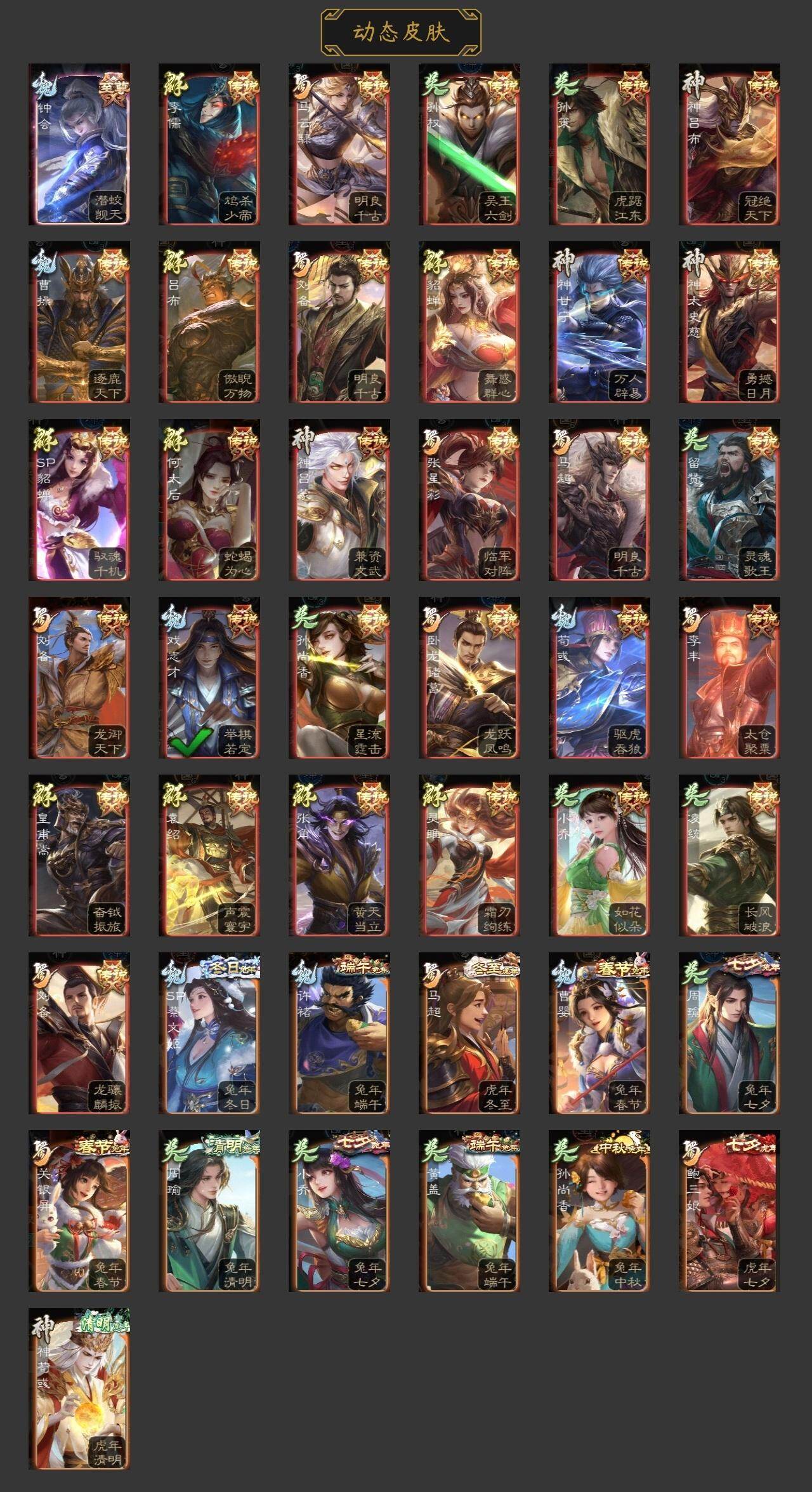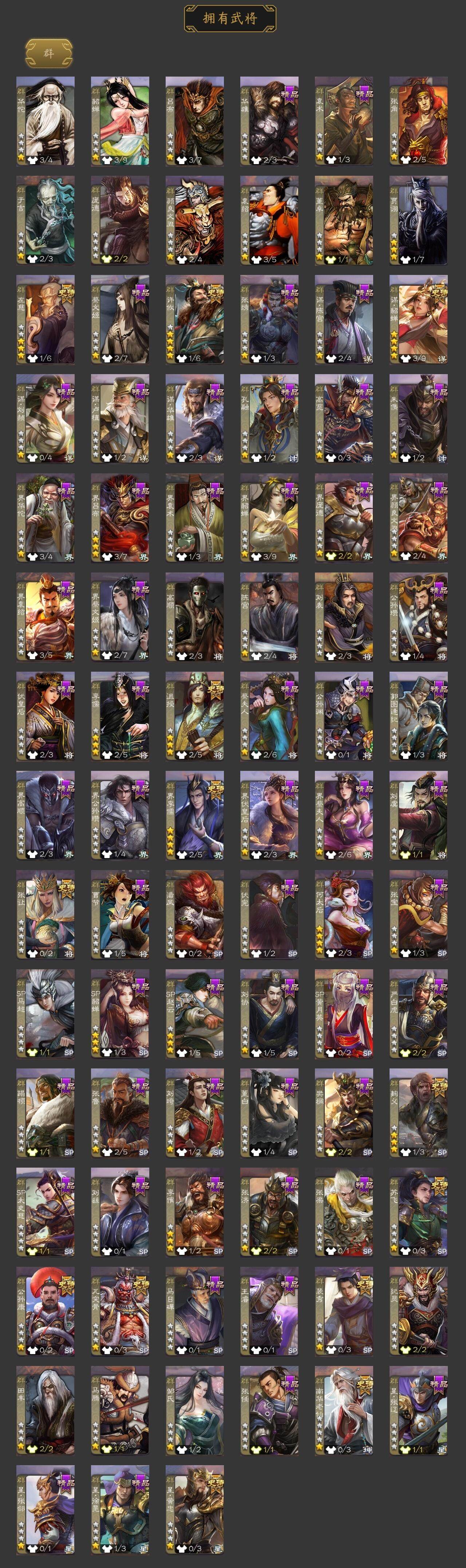 神吕布,神赵云,神陆逊,神甘宁,神张辽,神太史慈,神吕蒙,神周瑜,神诸葛亮,谋曹仁,杨修,文鸯,界钟会,界于禁,曹纯,戏志才,马云騄,谋马超,诸葛瞻,周群,赵襄,张星彩,沙摩柯,谯周,花鬘,董允,谋孙策,吴景,骆统,留赞,界徐盛,界步练师,谋孙权,谋貂蝉,裴秀,左慈,张让,星黄忠