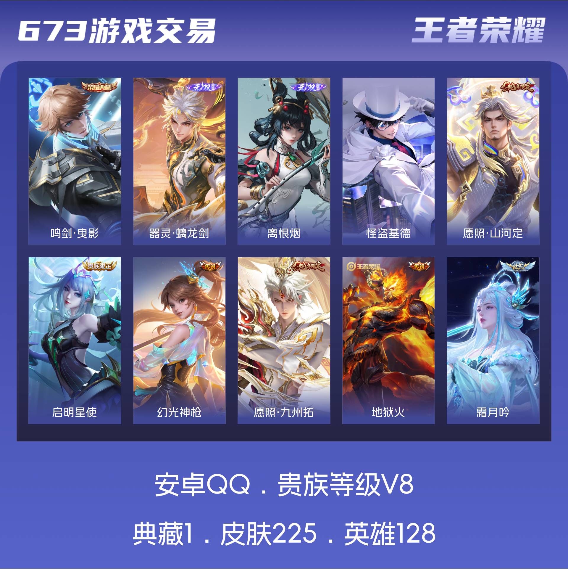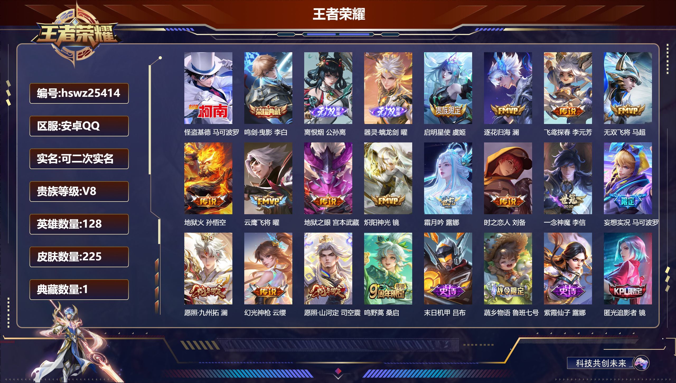 安卓QQ/永恒钻石/225皮肤/128英雄/1典藏/0珍品无双/2无双/1珍品传说/16传说/62史