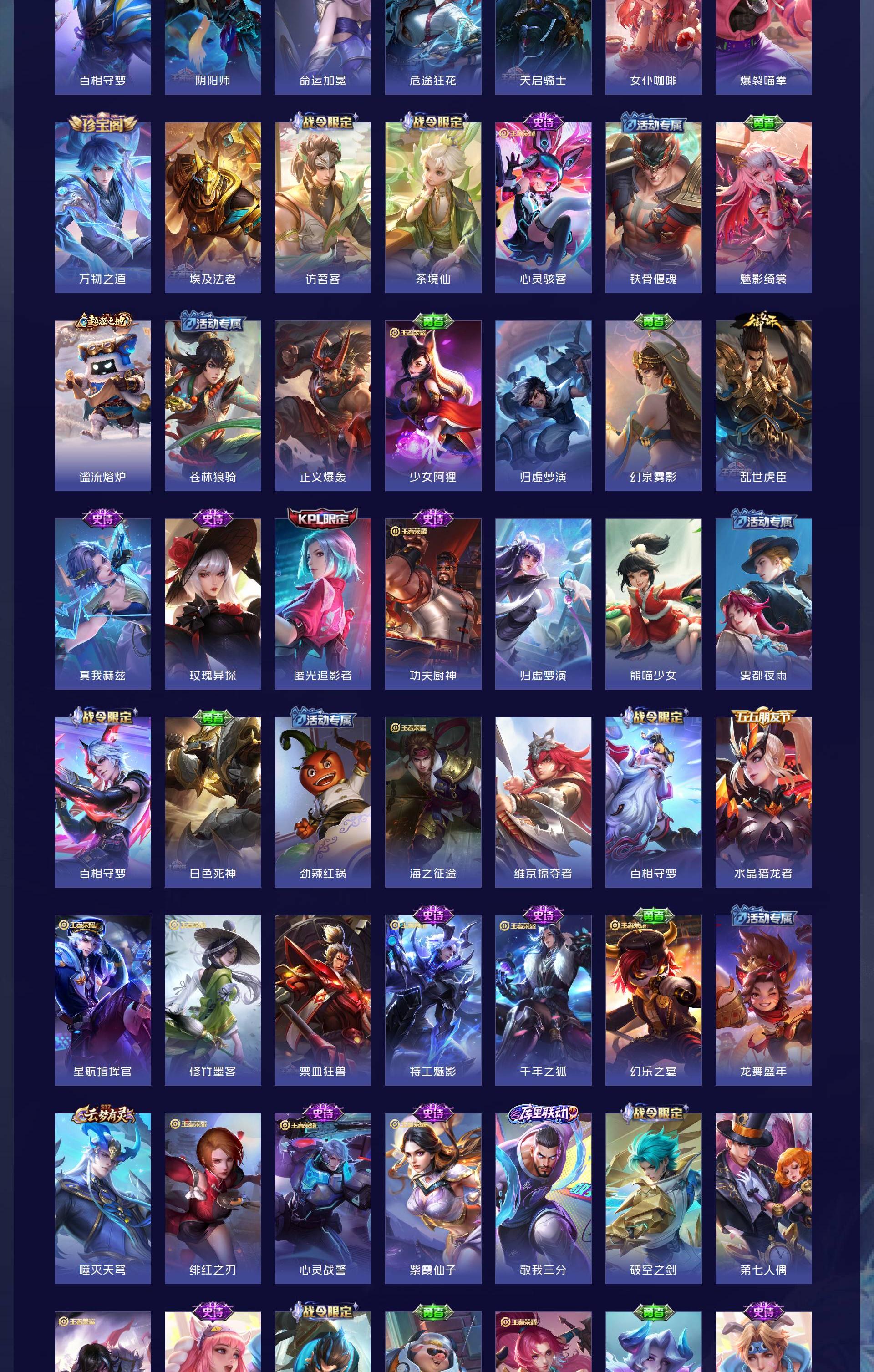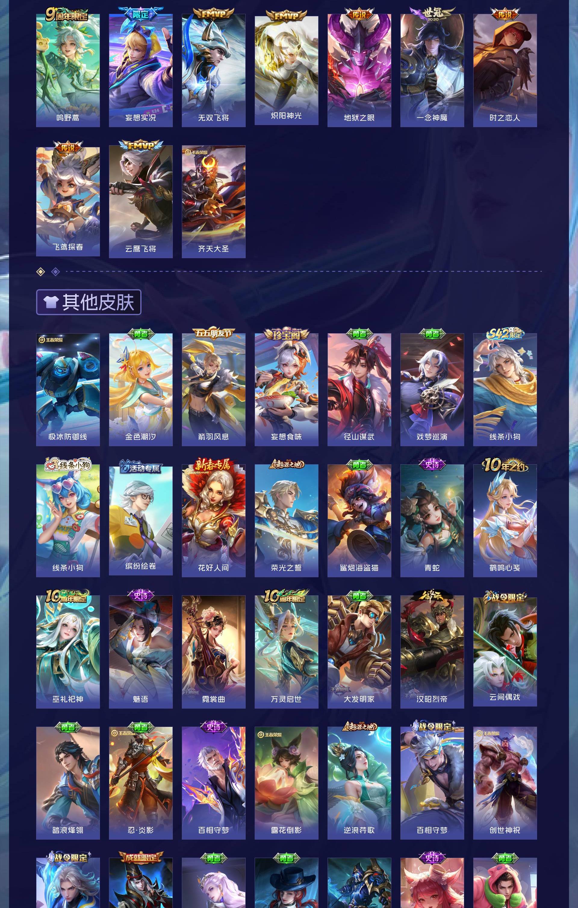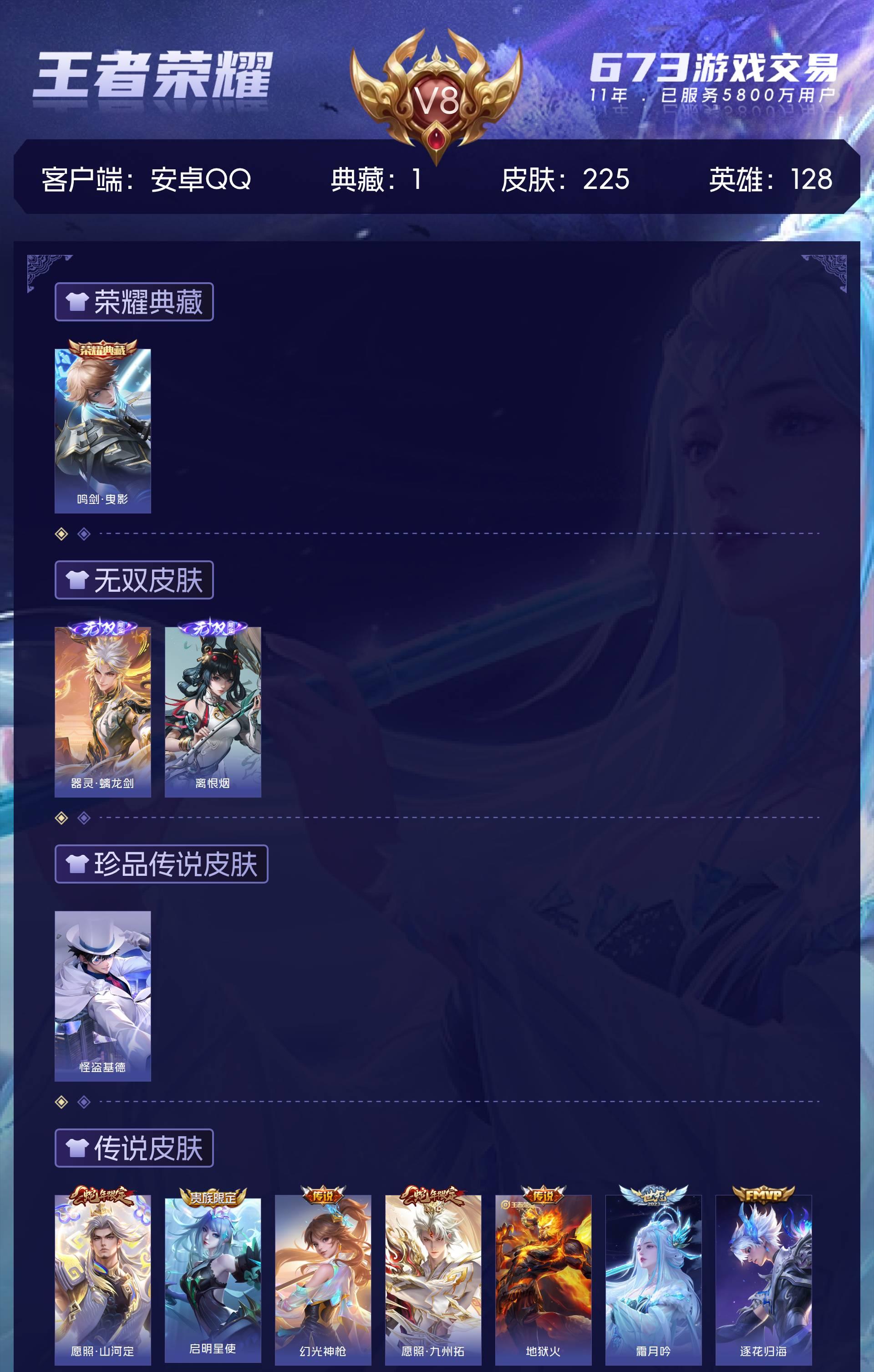 V8 皮肤225 英雄128 永恒钻石 荣耀典藏1 无双皮肤2 珍品传说1 传说17 其他皮肤211