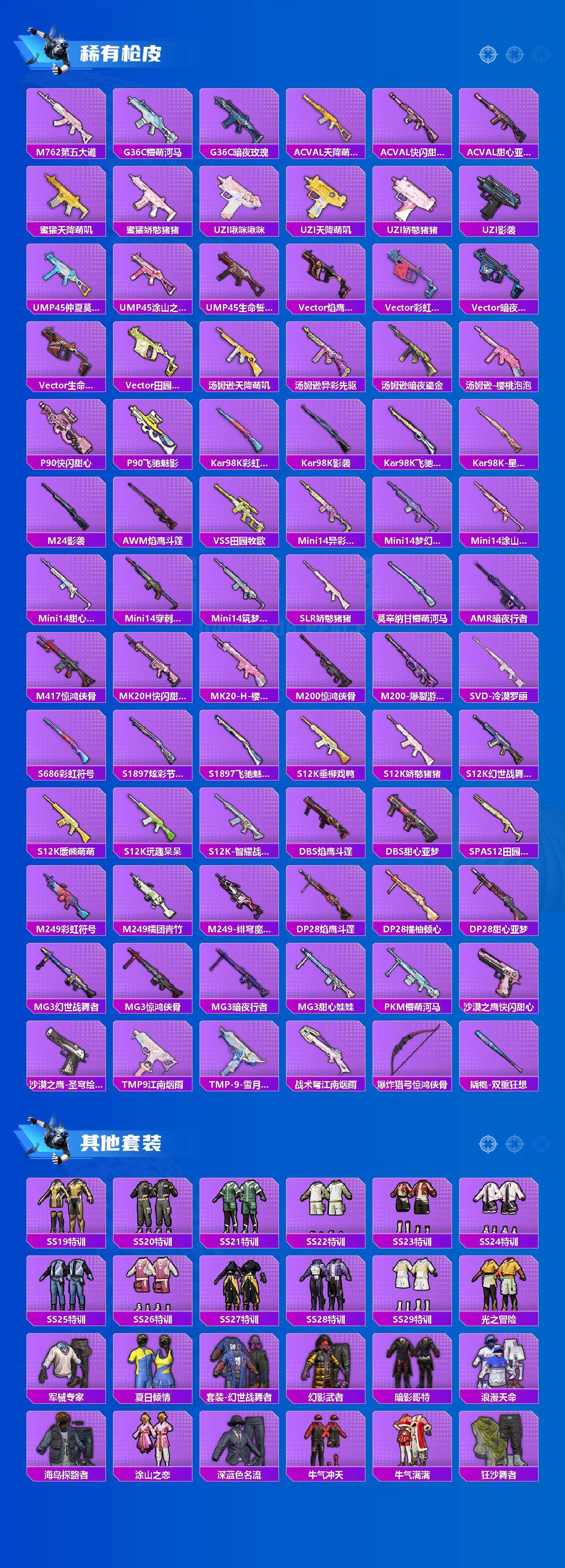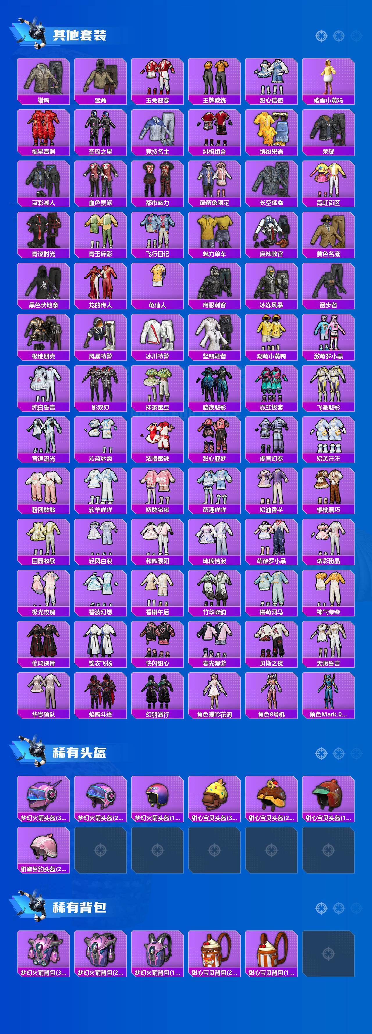 【热门品类】:粉装-梦幻火箭,粉装-缤纷油彩,套装-浪漫天命,套装-都市猎人,套装-派对舞王,套装-胖达团团,套装-暗夜行者,套装-龟仙人,套装-潮萌小黄鸭,套装-暗影哥特,角色-8号机,角色-Mark.06