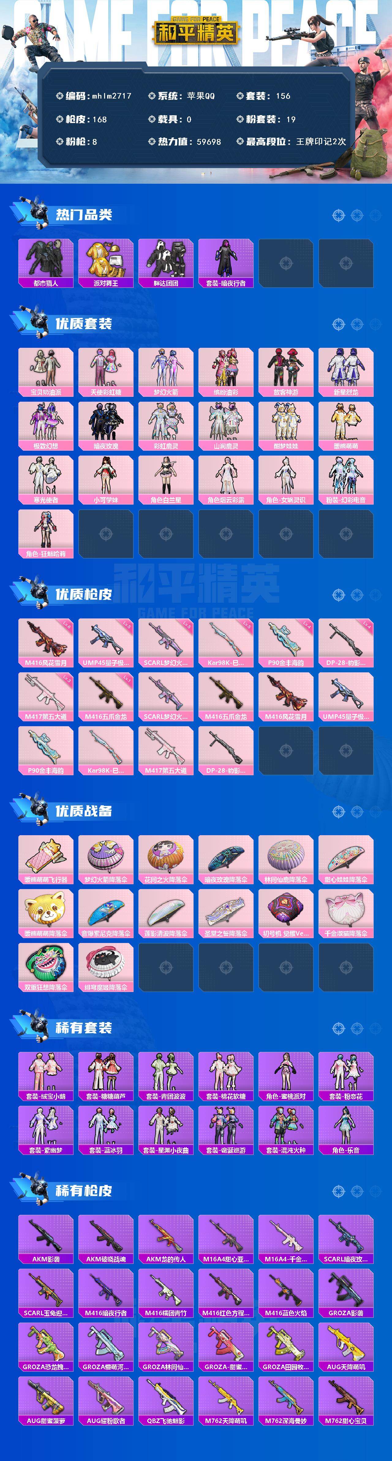 苹果 手Q-19粉装-8特效枪-0载具-1粉色飞行器-59698热力值-2王牌印记-156套装-168枪皮