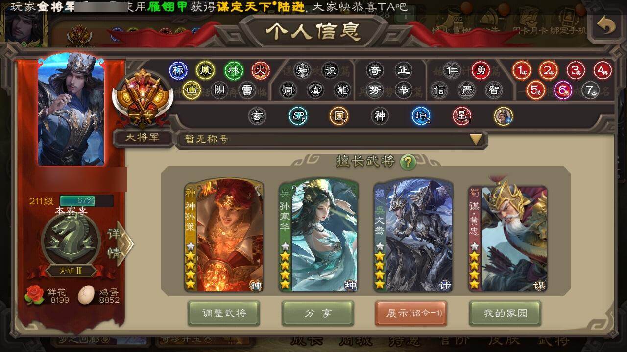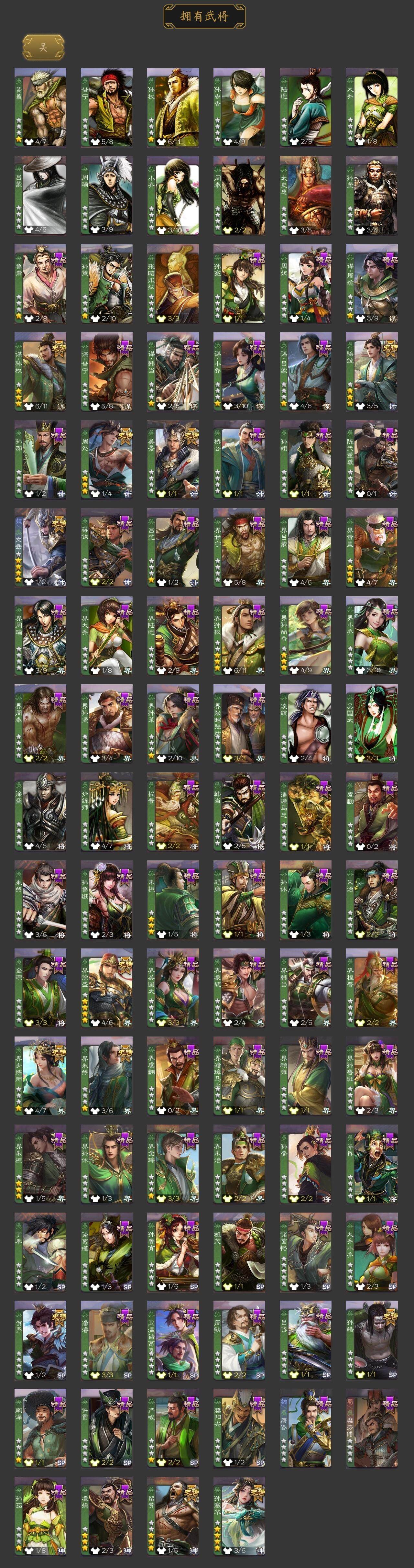 官阶:大将军;VIP等级:VIP12;史诗武将数量:87;动态皮肤数量:83;武将总数:463;史诗宝珠数量:25;将魂数量:1785;神将:12;魏国史诗武将:49;蜀国史诗武将:17;吴国史诗武将:11;群史诗武将:29