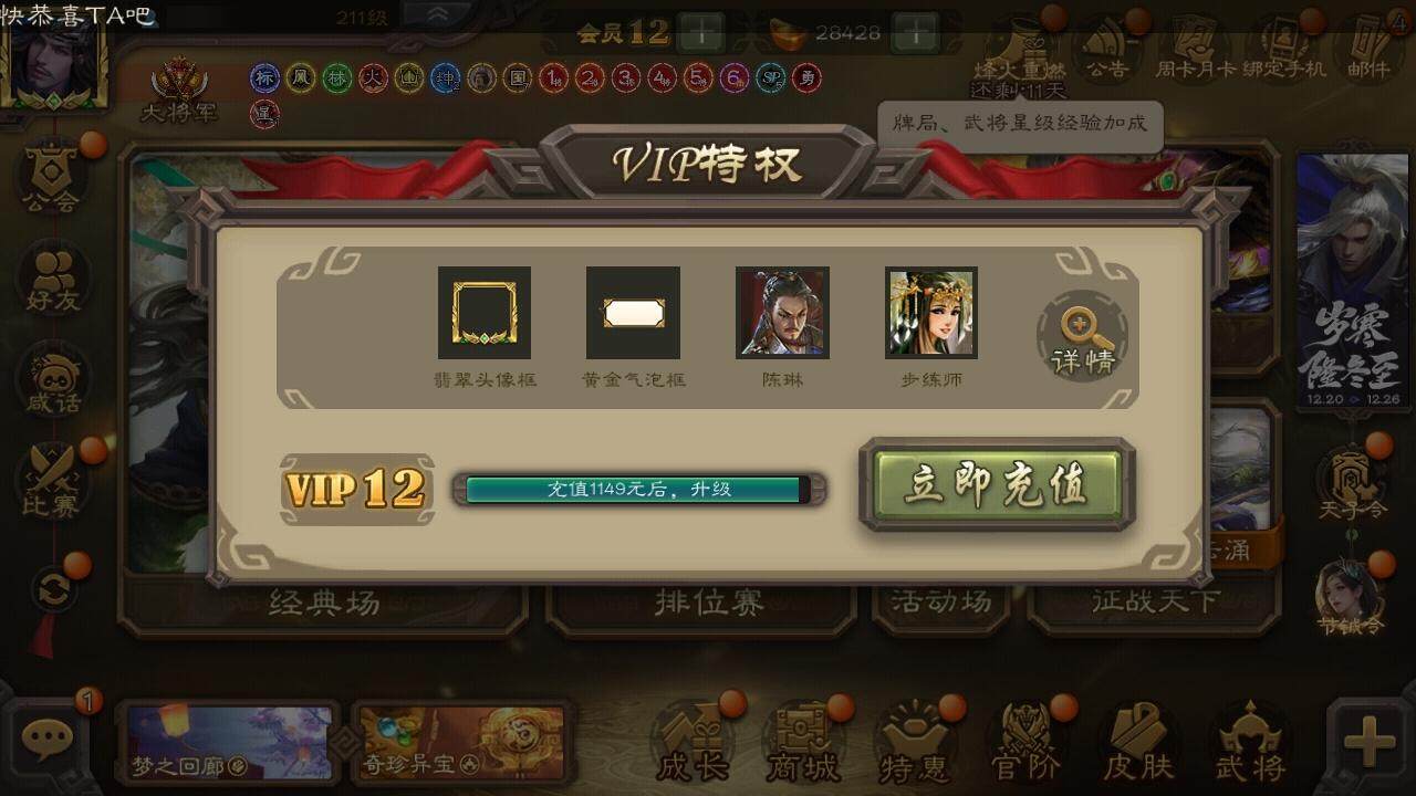 官阶:大将军;VIP等级:VIP12;史诗武将数量:87;动态皮肤数量:83