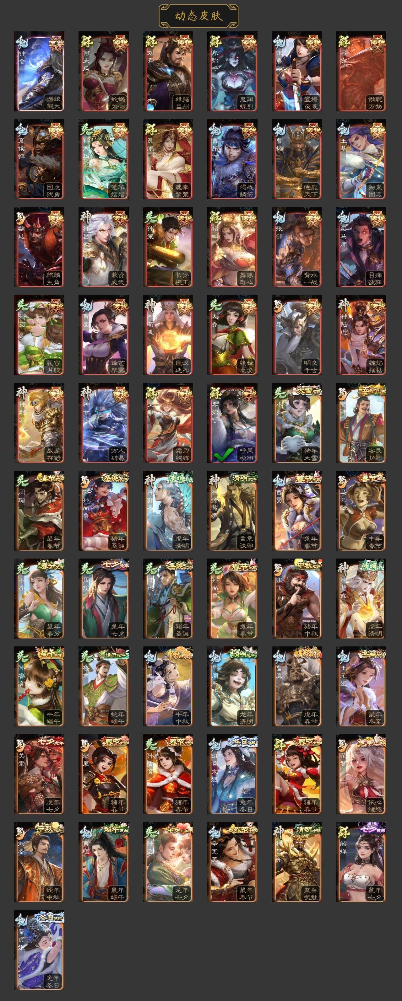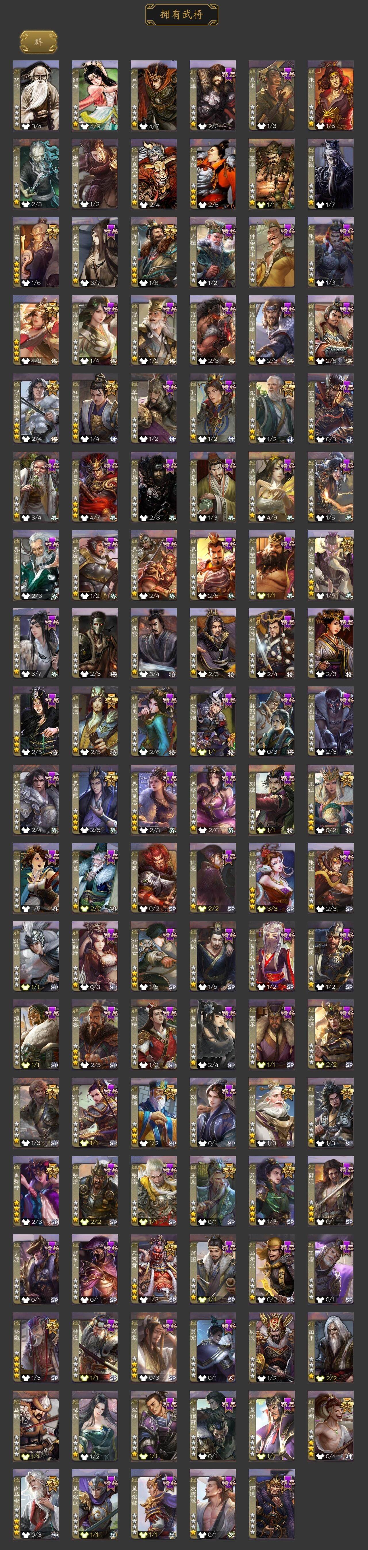 神吕布,神赵云,神陆逊,神甘宁,神张辽,神郭嘉,神太史慈,神荀彧,神吕蒙,神周瑜,神诸葛亮,SP司马昭,星周不疑,王粲,杨修,羊徽瑜,文鸯,王元姬,司马师,马钧,界钟会,界于禁,嵇康,郝昭,陈琳,曹婴,曹纯,戏志才,刘晔,关索,马云騄,谋黄忠,谋赵云,谋马超,周群,赵襄,王平,沙
