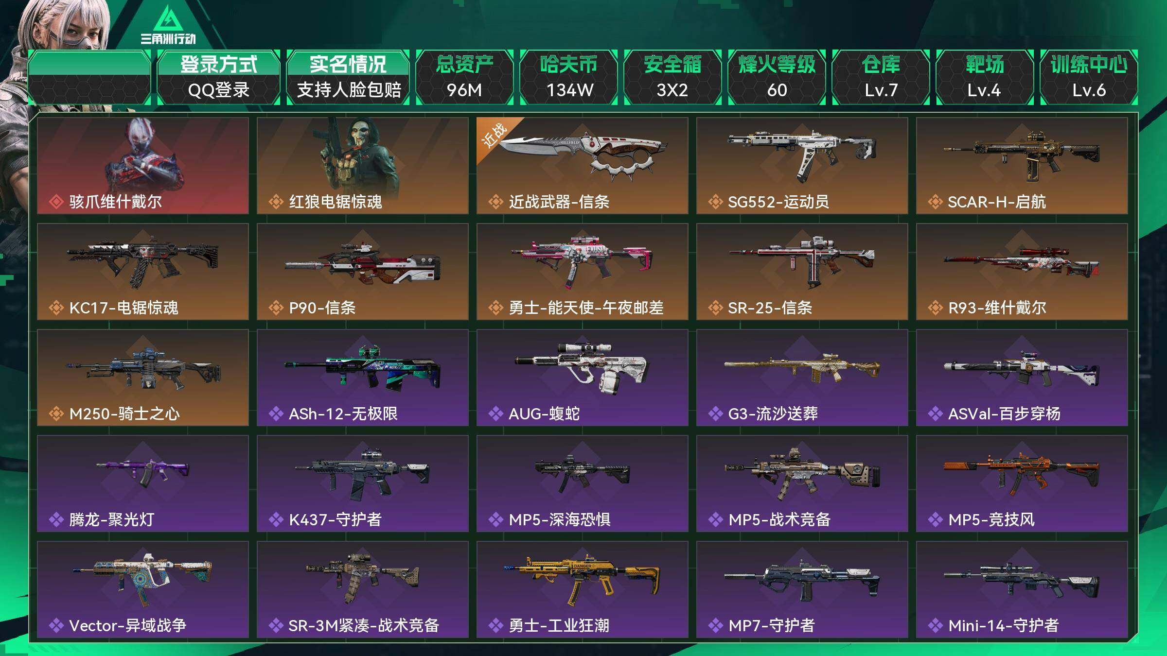 总资产:96M,哈夫币:134W,武器皮肤93;烽火60级:黑鹰Ⅴ,战场:上等兵Ⅲ,【安全箱】高级安全箱;【特勤处等级】仓库LV.7,靶场LV.4,训练中心LV.6,收藏室LV.0,潜水中心LV.0;【捆绑包3】维什戴尔捆绑包,电锯惊魂干员捆绑包,信条捆绑包;【干员皮肤2】骇爪维什戴尔,红狼电锯惊魂;【近战皮肤】近战武器-信条,近战武器-黑鹰;【步枪皮肤】SG552突击步枪-运动员,SCAR-H战斗步枪-启航,KC17突击步枪-电锯惊魂,ASh-12战斗步枪-无极限,AUG突击步枪-蝮蛇,G3战