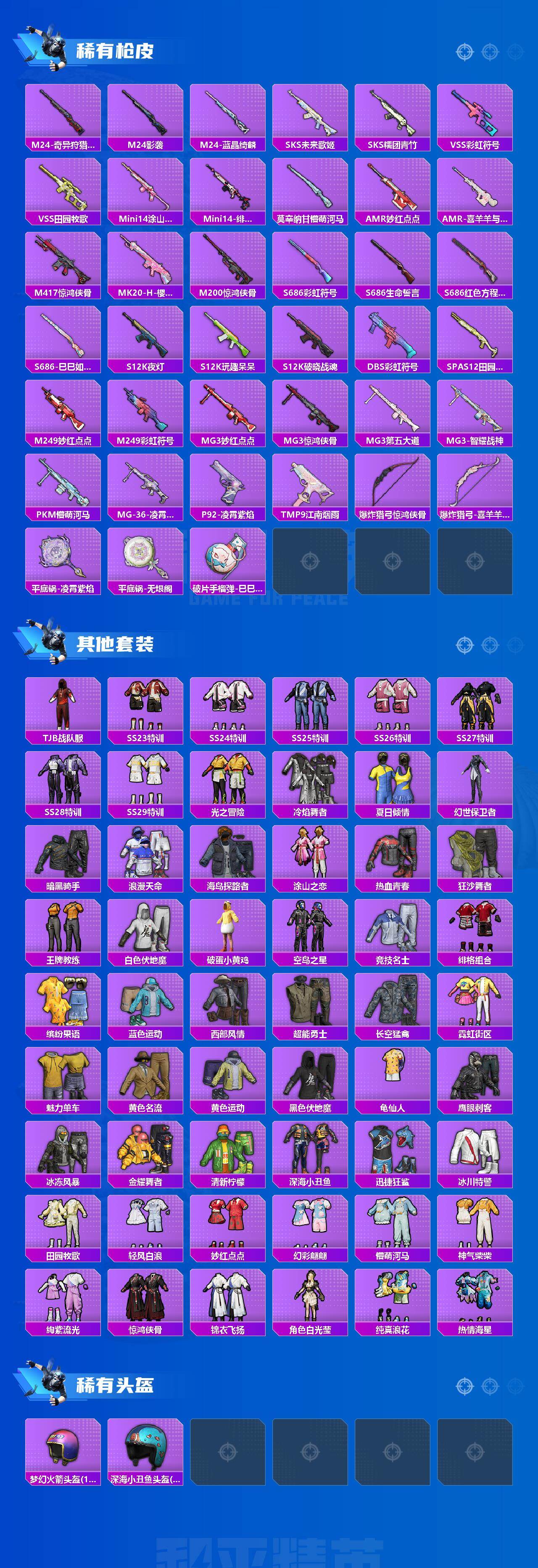 【粉色枪皮等级】:M416-电玩时刻(五级),AUG-暖羊咩咩(五级),UMP45-量子极限(五级),Kar98K-巳巳如意(五级),Mk14-精灵梦叶罗丽(四级),MK12-雪月幻音(五级),DP-28-豹影疾电(五级),MG-36-