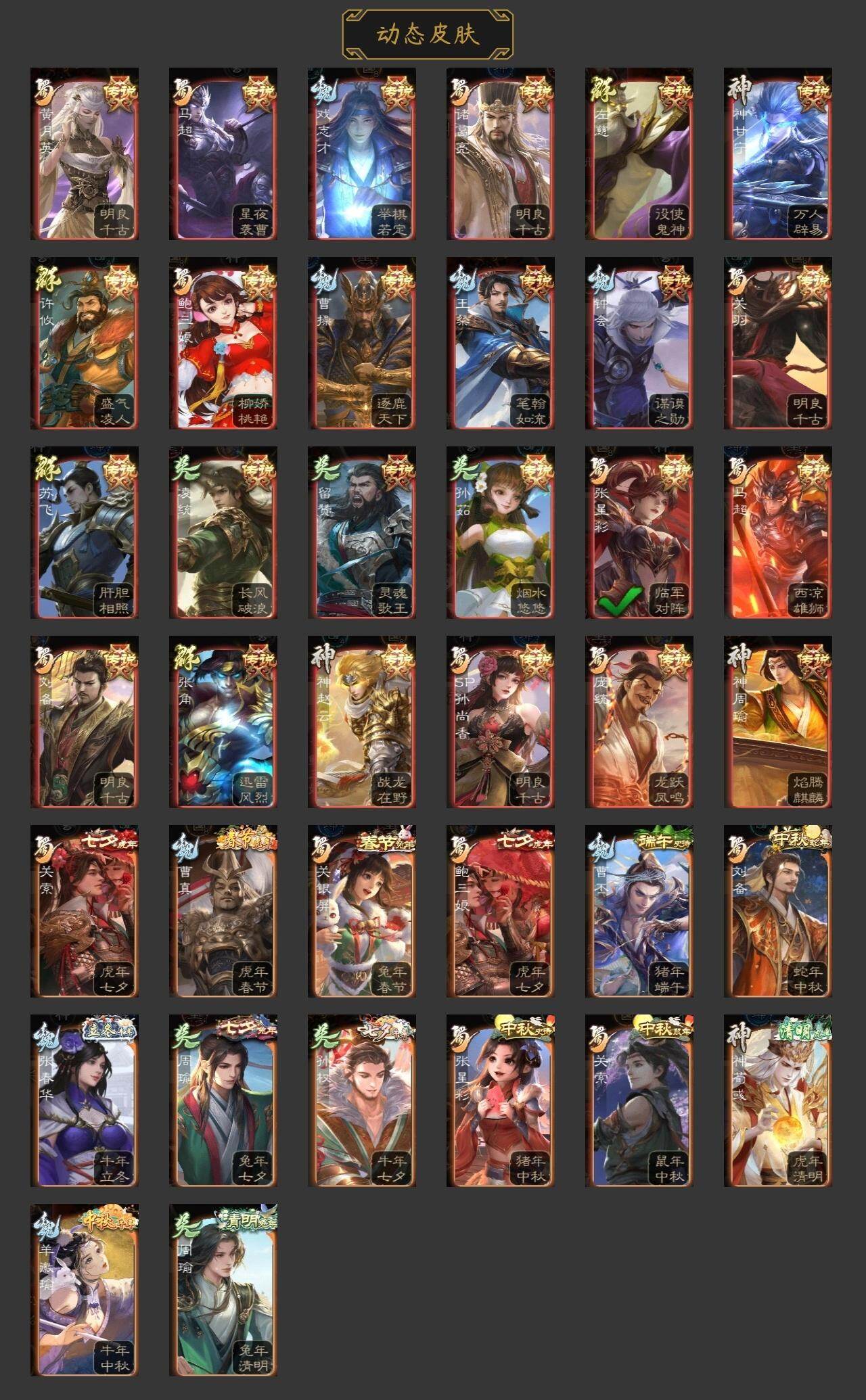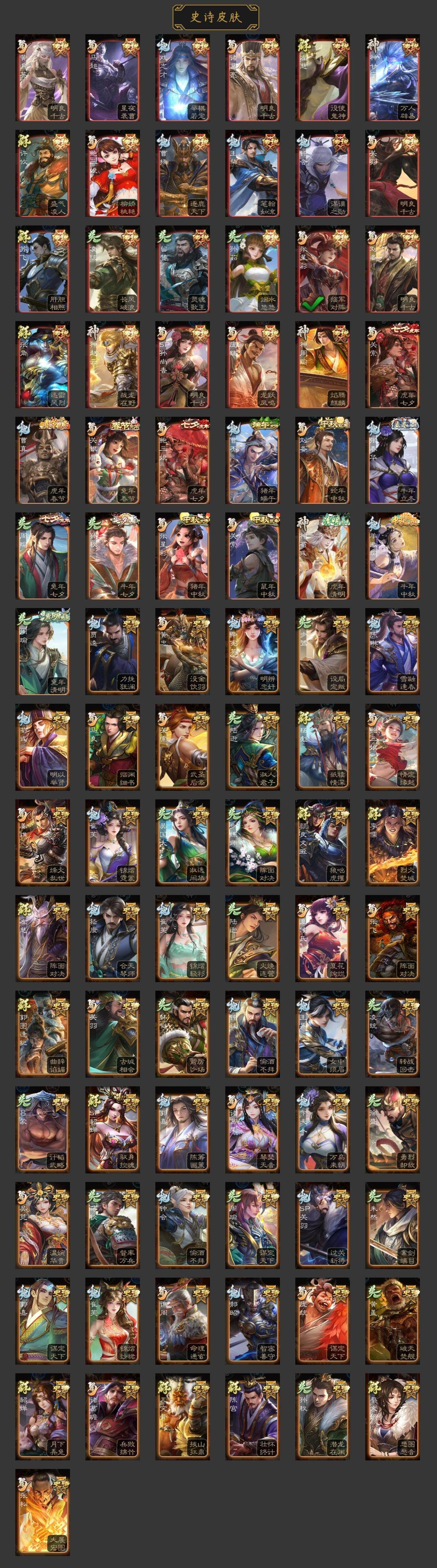 神吕布,神赵云,神甘宁,神张辽,神太史慈,神孙策,神荀彧,神诸葛亮,杨修,王凌,马钧,界钟会,界于禁,界曹真,嵇康,郝昭,陈琳,曹纯,戏志才,程昱,关索,谋夏侯氏,谋赵云,谋马超,周群,张星彩,王平,谯周,界黄忠,花鬘,鲍三娘,吴景,留赞,界朱然,界徐盛,贺齐,文鸯,谋公孙瓒,左慈