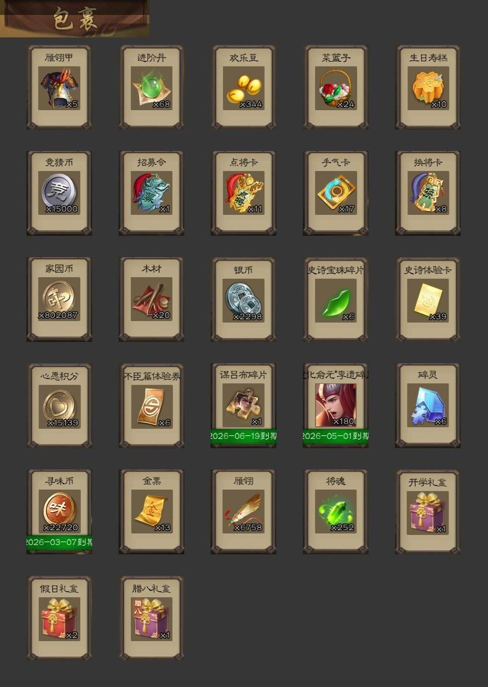 官阶:大将军;VIP等级:VIP12;史诗武将数量:50;动态皮肤数量:33;武将总数:404;史诗宝珠数量:0;将魂数量:252;神将:8;魏国史诗武将:16;蜀国史诗武将:11;吴国史诗武将:7;群史诗武将:14