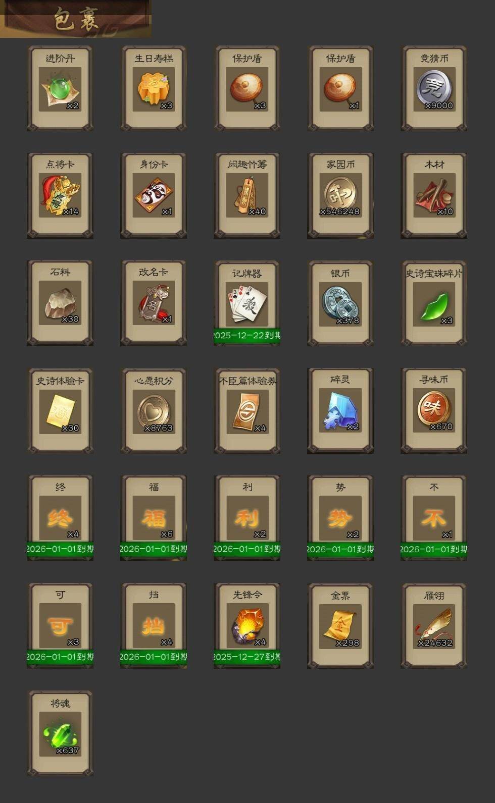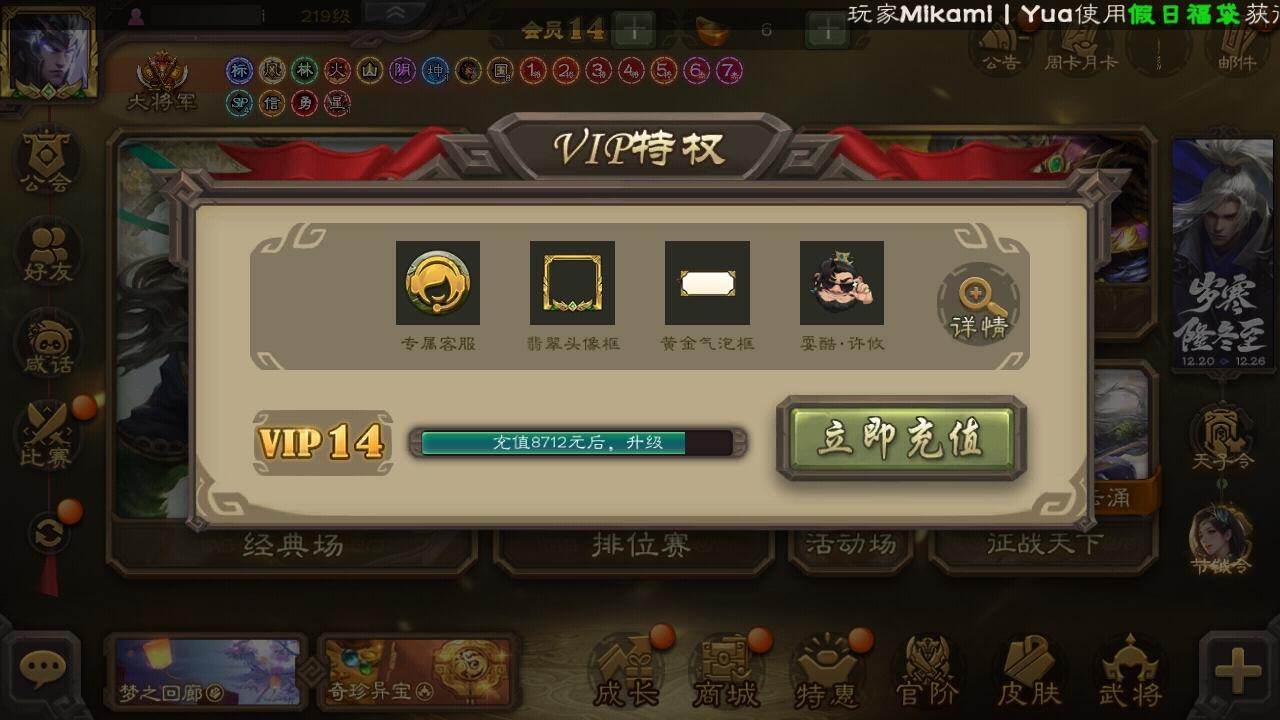 官阶:大将军;VIP等级:VIP14;史诗武将数量:67;动态皮肤数量:34