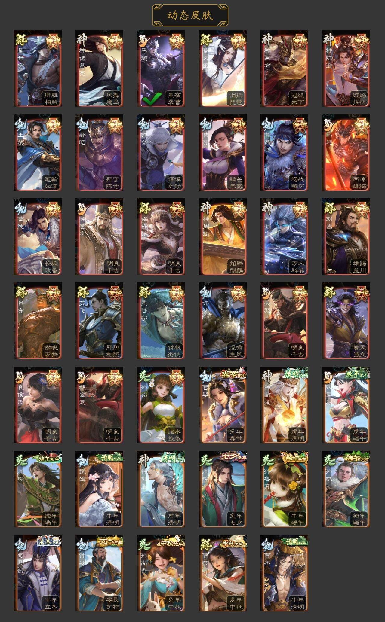 神吕布,神赵云,神陆逊,神甘宁,神张辽,神郭嘉,神太史慈,神孙策,神荀彧,神关羽,神吕蒙,神周瑜,神诸葛亮,王粲,杨修,文鸯,王元姬,王凌,司马师,马钧,界钟会,界于禁,界曹真,嵇康,郝昭,陈琳,曹婴,曹纯,戏志才,关索,马云騄,谋黄忠,谋赵云,谋马超,周群,赵襄,张星彩,王平,