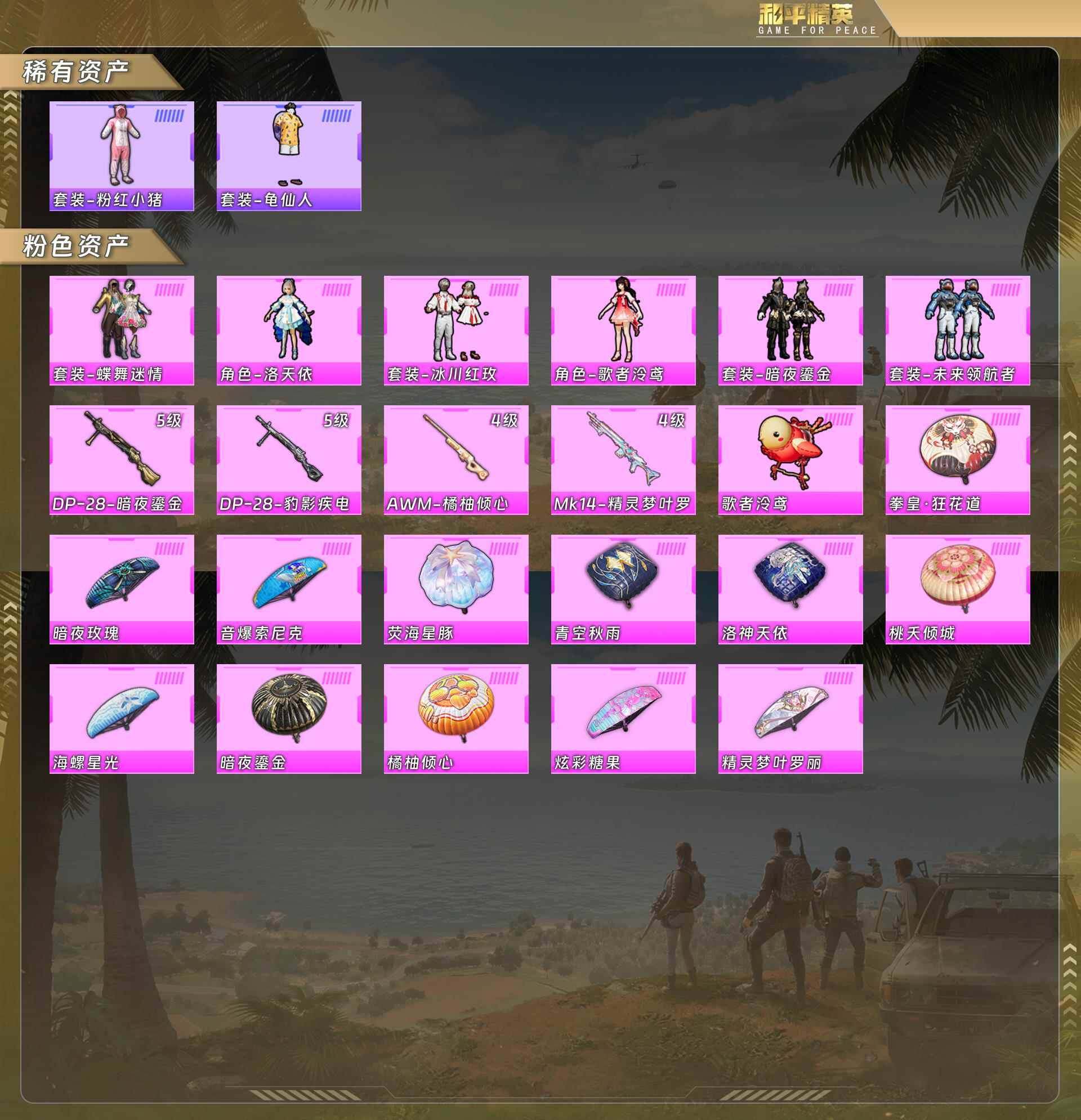 (6粉装-4粉枪)粉红小猪/蝶舞迷情/洛天依/冰川红玫/歌者泠鸢/暗夜鎏金/未来领航者/DP28暗夜鎏金5级/DP28豹影疾电5级/AWM橘柚倾心4级/Mk精灵梦叶罗丽4级 没战神框 HP5440-0载具-1粉色飞行器-52722热力值-6王牌印记-132套装-161枪皮