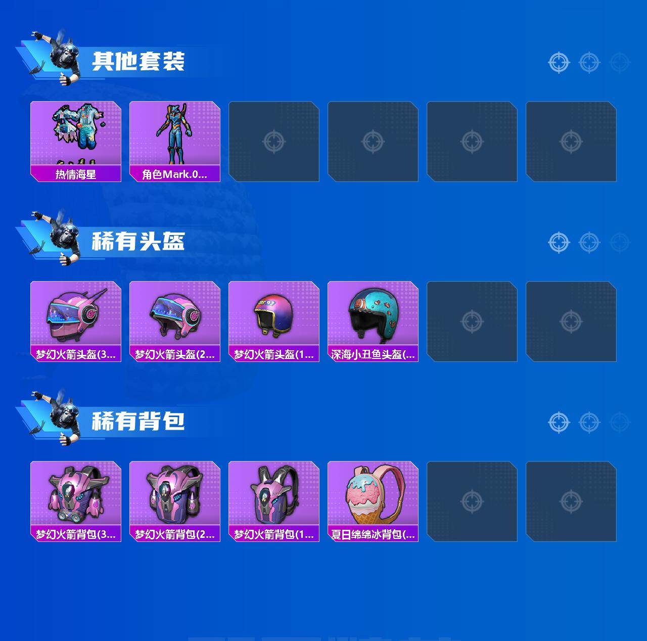 【热门品类】:粉装-梦幻火箭,粉装-缤纷油彩,套装-都市猎人,套装-龟仙人,角色-Mark.06,撬棍-龙胆亮银枪