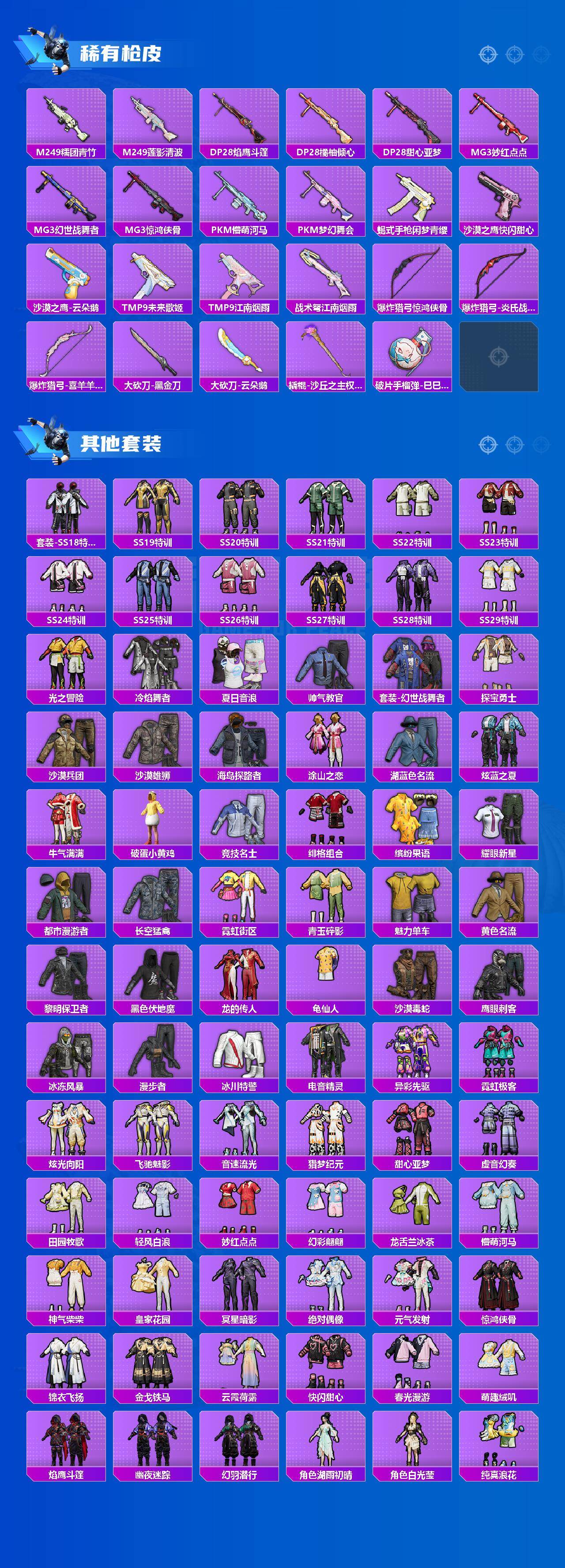 【粉色套装】:粉装-木曜青龙,粉装-梦幻火箭,粉装-缤纷油彩,粉装-极致幻想,粉装-冰霜白皇,粉装-炙焰红王,粉装-绿野邂逅,角色-呆萌星弥,粉装-未来歌姬,角色-阿尔茜,粉装-蜜语绒猫,角色-冷漠罗丽