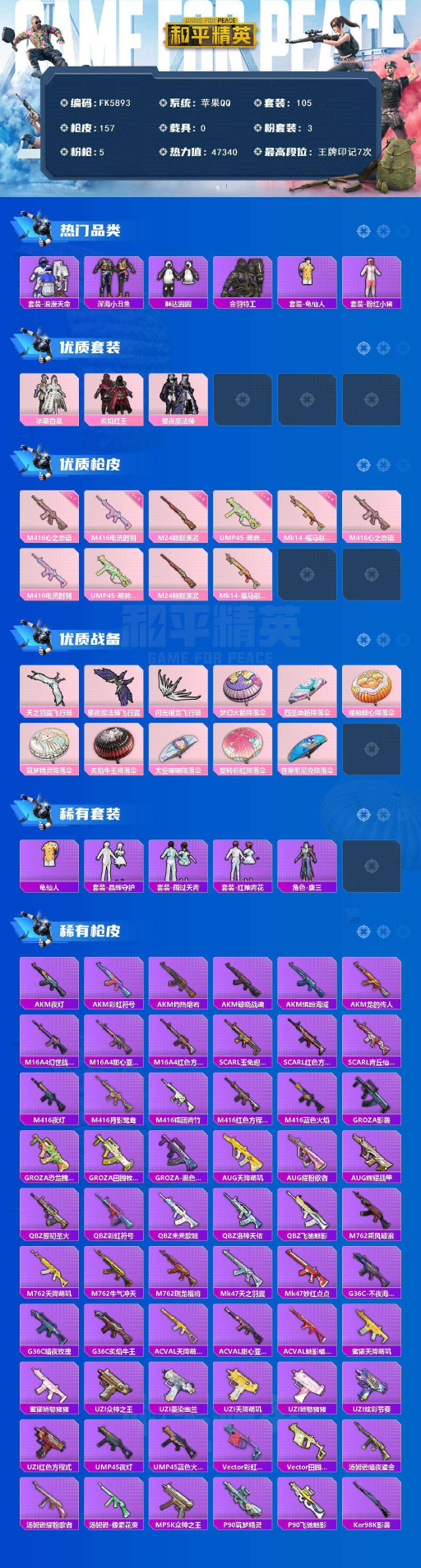 款身法素材号-胖达圆圆-深海小丑鱼-七级M416-心之恋语-3粉装5特效枪-地铁45点天赋-游戏等级62】苹果 手Q-3粉装-5特效枪-0载具-3粉色飞行器-47340热力值-7王牌印记-105套装-157枪皮 【热门品类】:套装-浪漫天命,套装-深海小丑鱼,套装-胖达圆圆,套装-金羽特工,套装-龟仙人,套装-粉红小猪 【粉色套装】:粉装-冰霜白皇,粉装-炙焰红王,粉装-星夜魔
