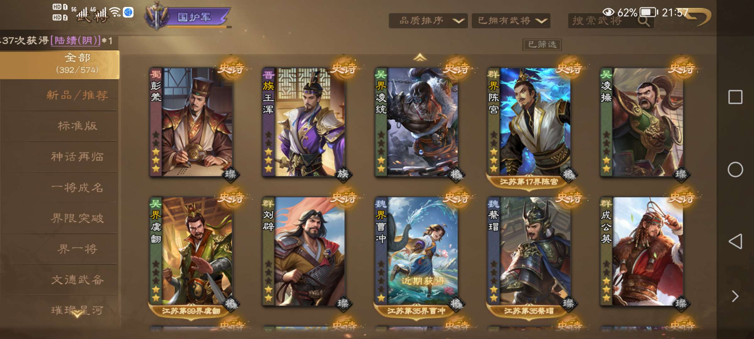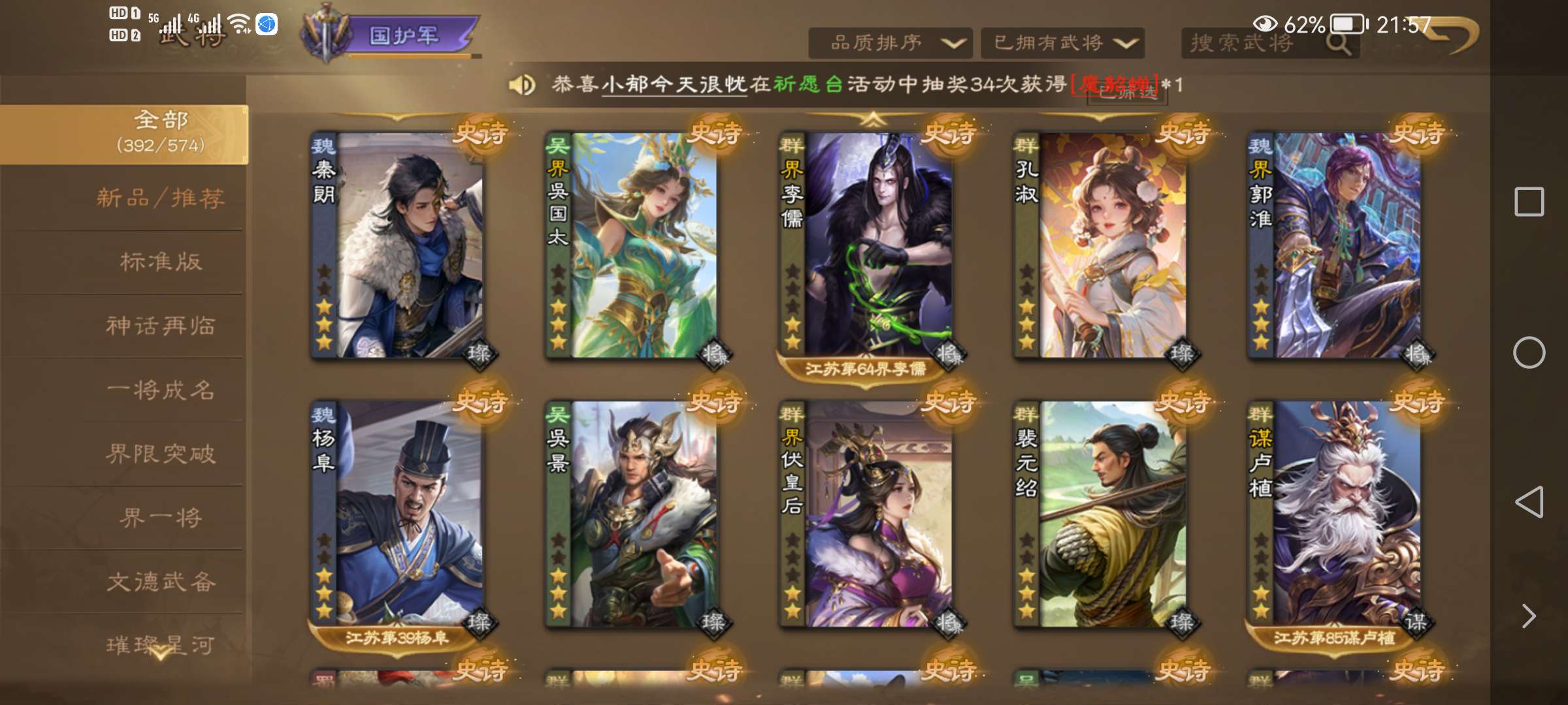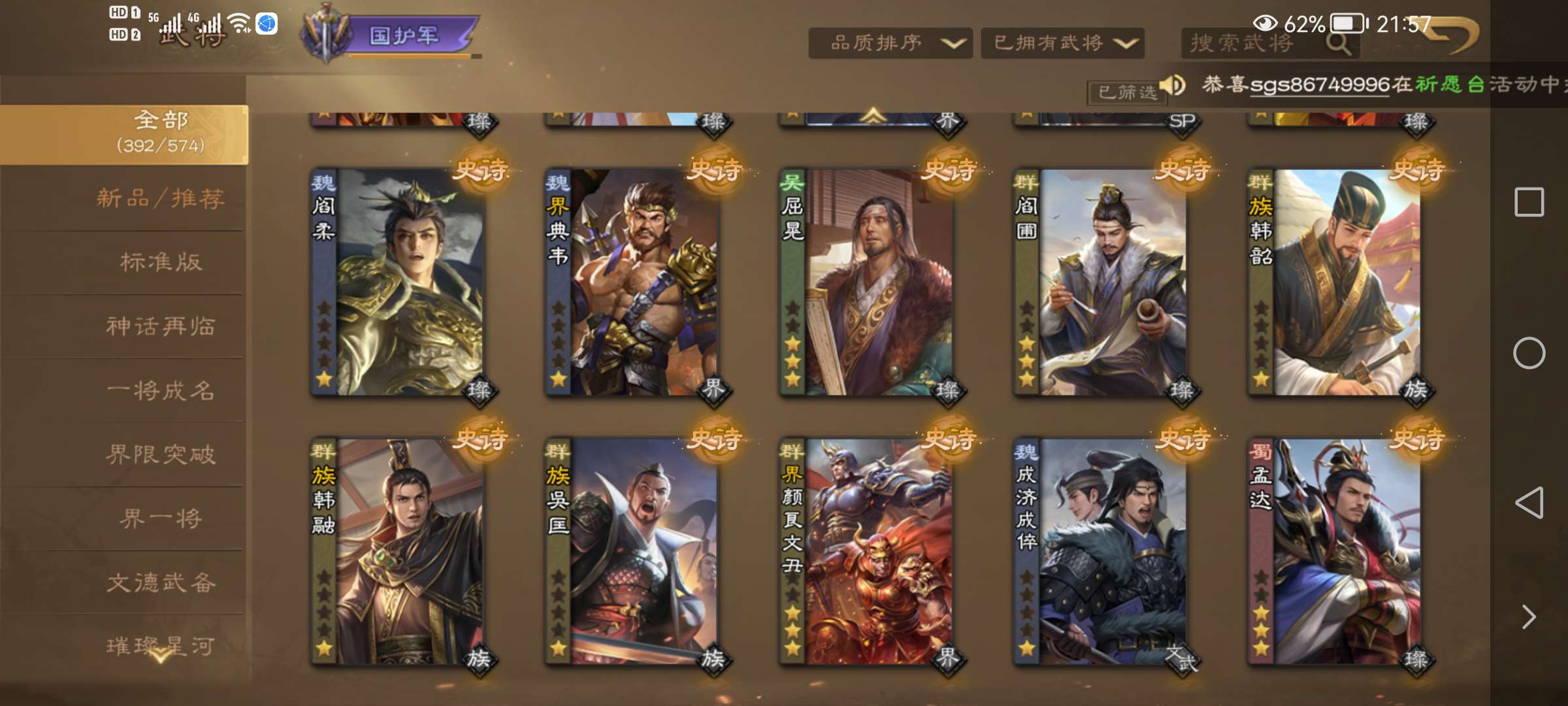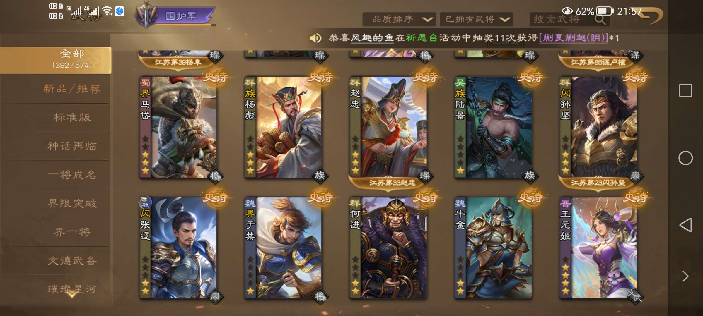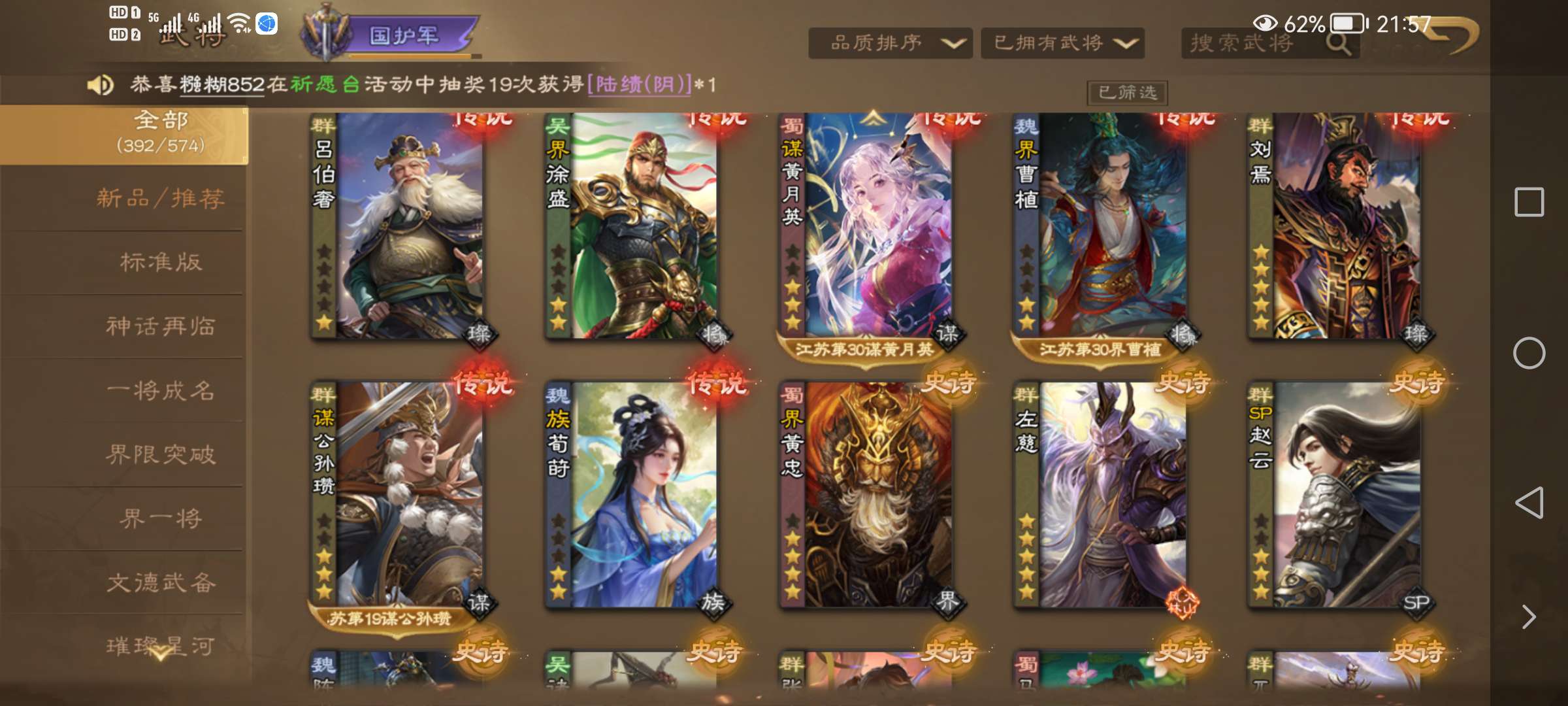 族荀彧动皮,V10族荀时,谋公孙瓒动皮,谋黄月英皮肤,卢氏,SP张郃等很多强力史诗,精品死绑号