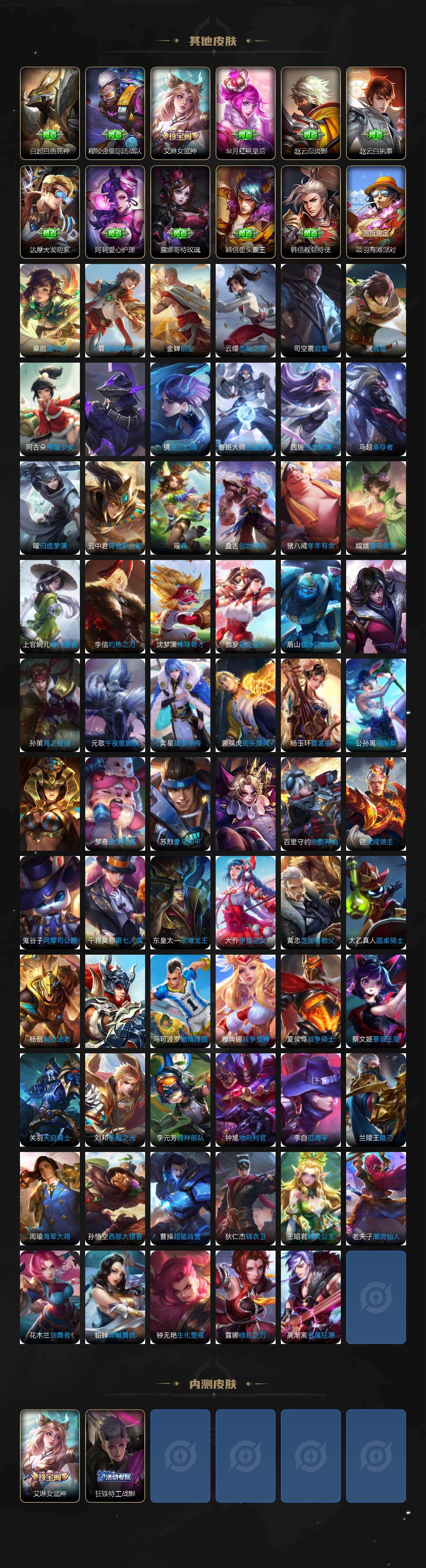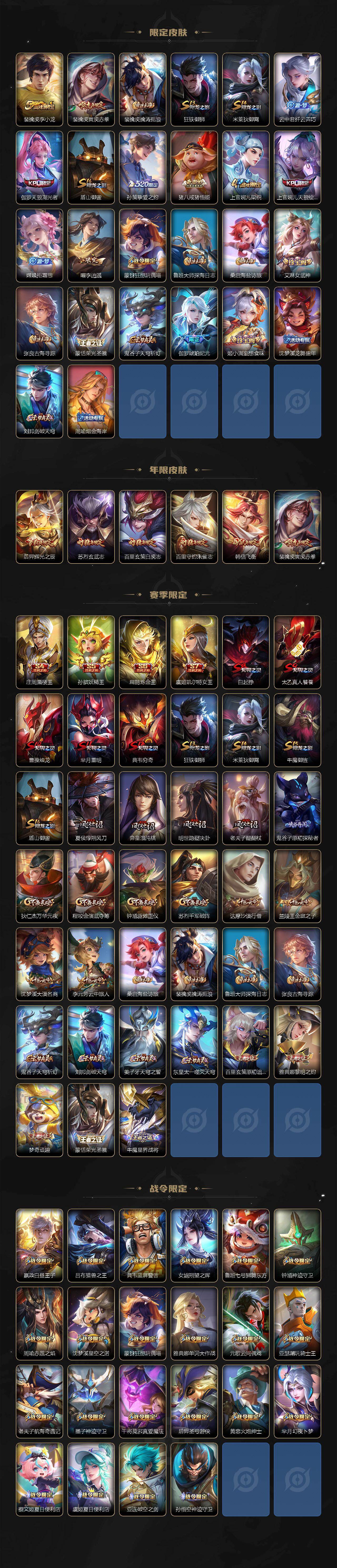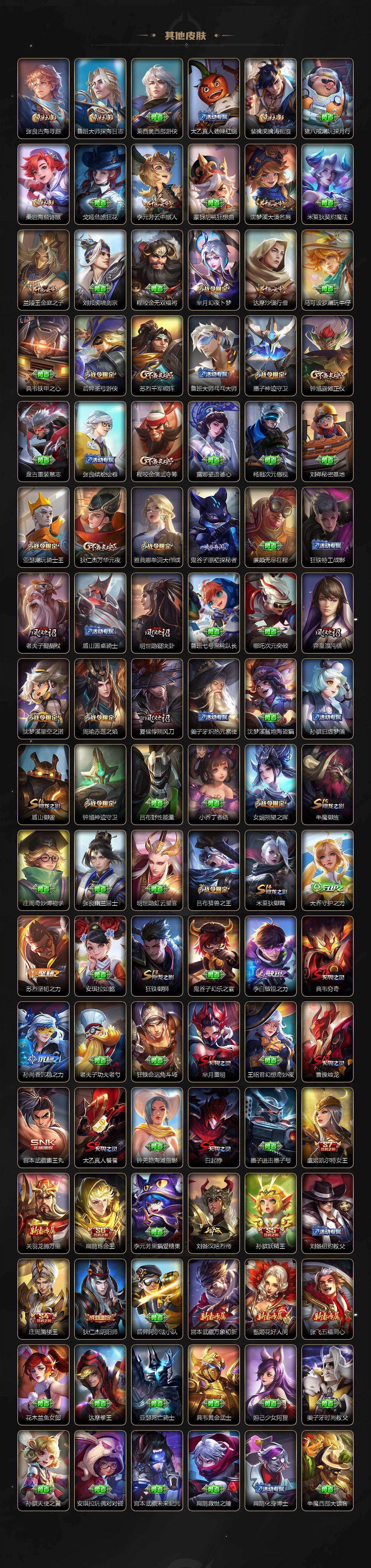 【传说皮肤】:后羿神树通天,桑启鸣野蒿,孙策挚爱之约,裴擒虎寅虎赤拳,西施游龙清影,曜李逍遥 ,镜炽阳神光,虞姬启明星使,关羽武圣,曜云鹰飞将,李信一念神魔,达摩黄金狮子座,百里玄策白虎志,花木兰冠军飞将,梦奇胖达荣荣,貂蝉仲夏夜之梦,孙尚
