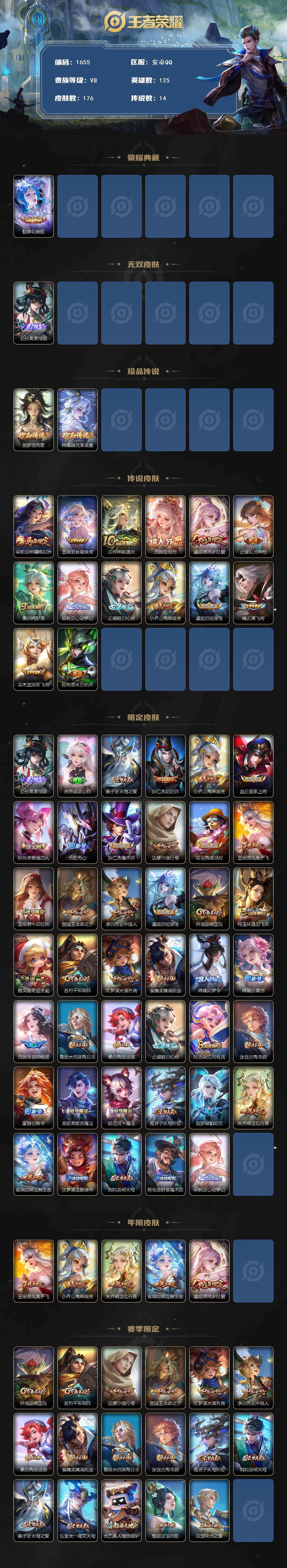 /【极品女号!! 离恨烟 伽罗新珍品 朵莉亚马年限定】安卓Q-V8-至尊星耀V段位-125英雄-176皮肤-1典藏皮肤-1无双-2珍品传说-14传说-52史诗