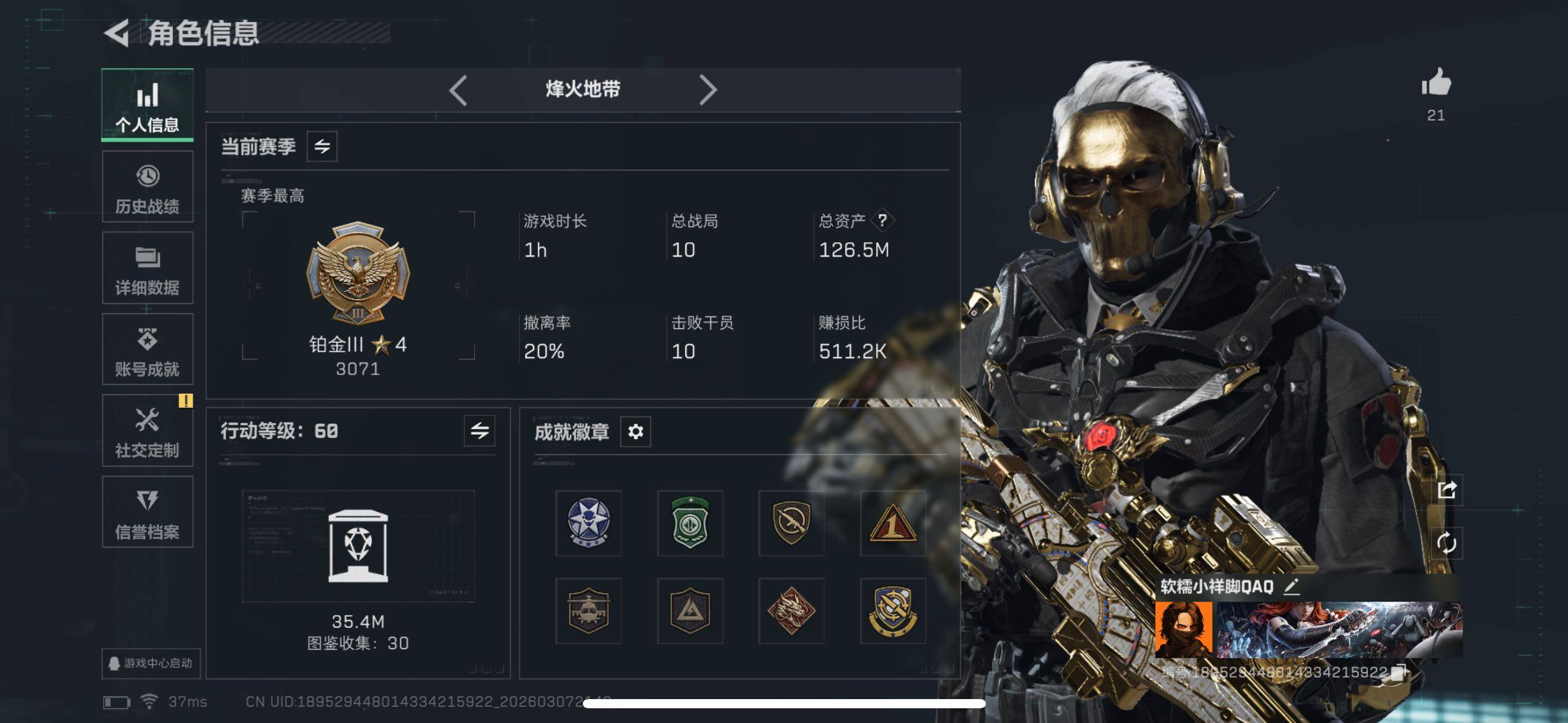 126m总资产-9643k哈伏币-60烽火等级-铂金-14战场等级-列兵【干