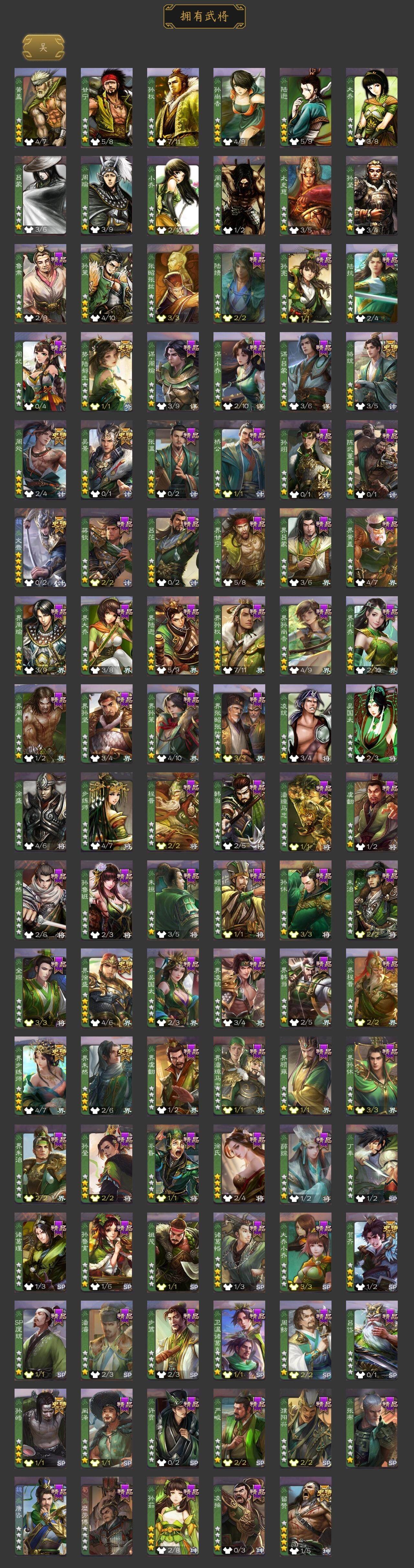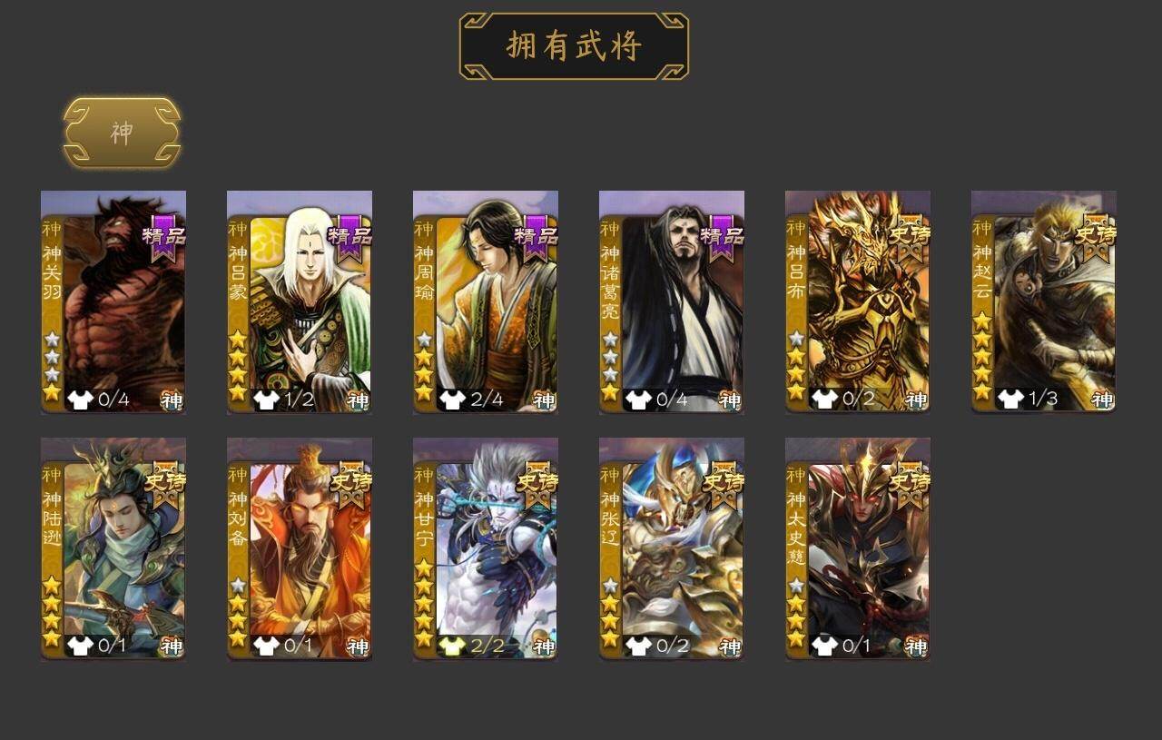 神吕布,神赵云,神陆逊,神刘备,神甘宁,神张辽,神太史慈,神关羽,神吕蒙,神周瑜,神诸葛亮,SP司马昭,星周不疑,王粲,杨修,文鸯,王元姬,王凌,司马师,马钧,界钟会,界于禁,界曹真,嵇康,郝昭,陈琳,曹婴,曹纯,戏志才,刘晔,谋曹丕,关索,马云騄,谋赵云,谋马超,诸葛瞻,周