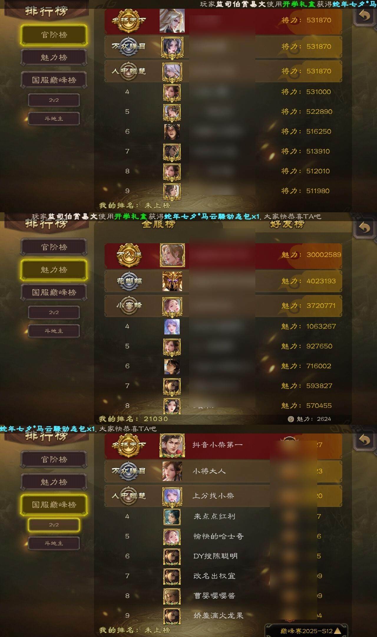 官阶:大将军;VIP等级:VIP14;史诗武将数量:76;动态皮肤数量:63