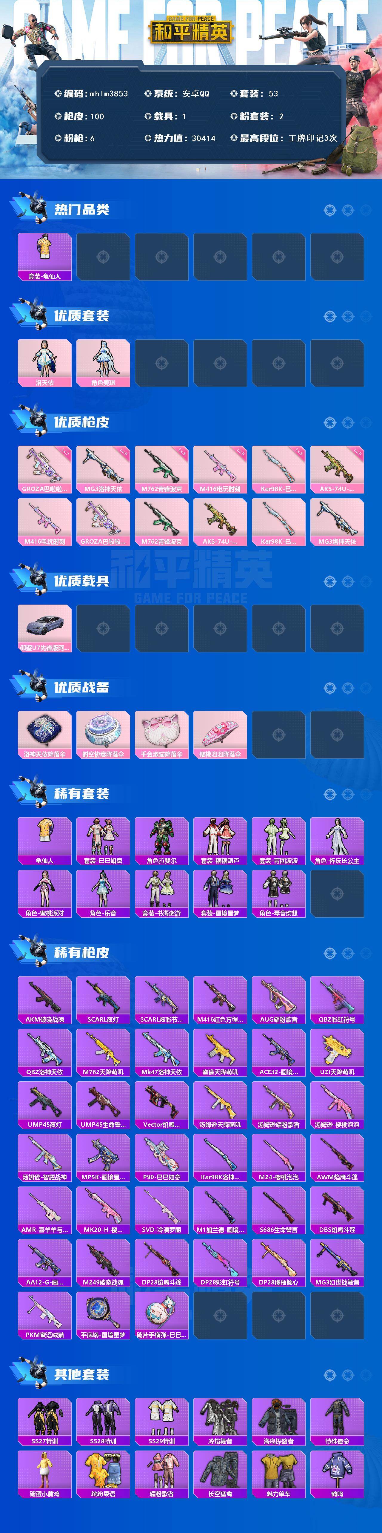 安卓 手Q-2粉装-6特效枪-1载具-1粉色飞行器-30414热力值-3王牌印记-53套装-100枪皮