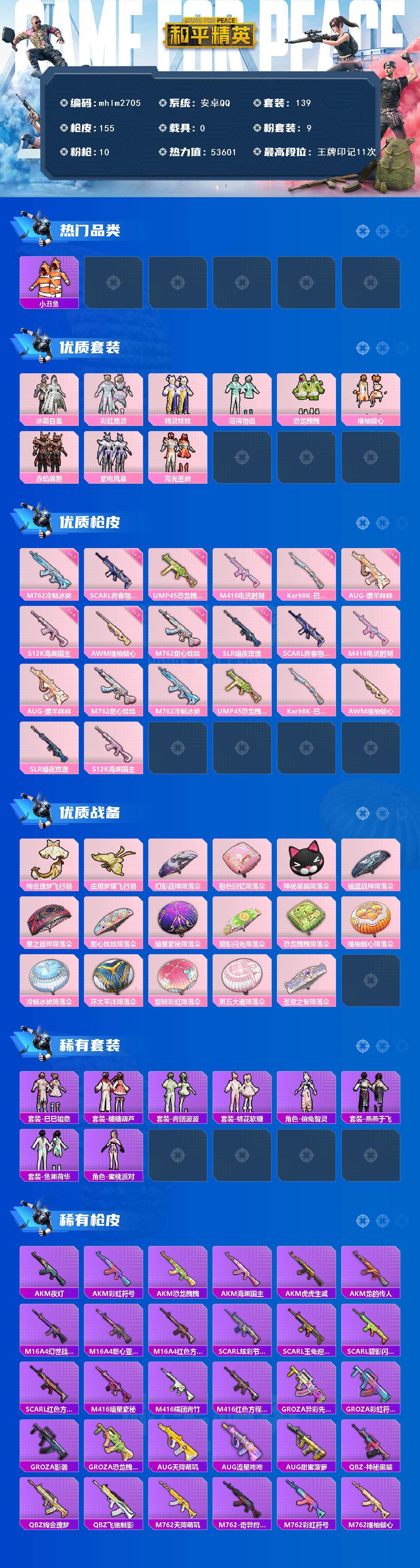 安卓 手Q-9粉装-10特效枪-0载具-2粉色飞行器-53601热力值-11王牌印记-139套装-155枪皮