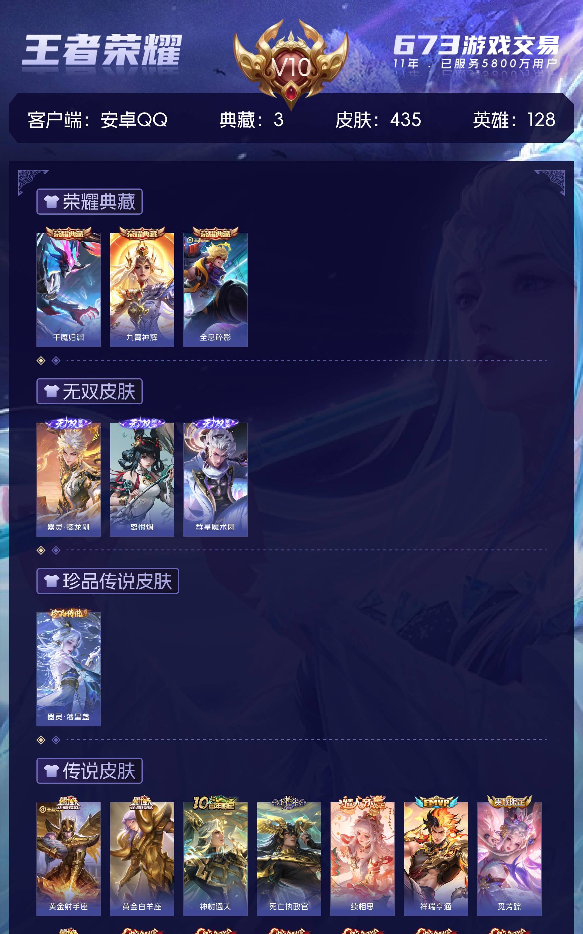V10 皮肤435 英雄128 无双王者 荣耀典藏3 无双皮肤3 珍品传说1 传说58 其他皮肤376