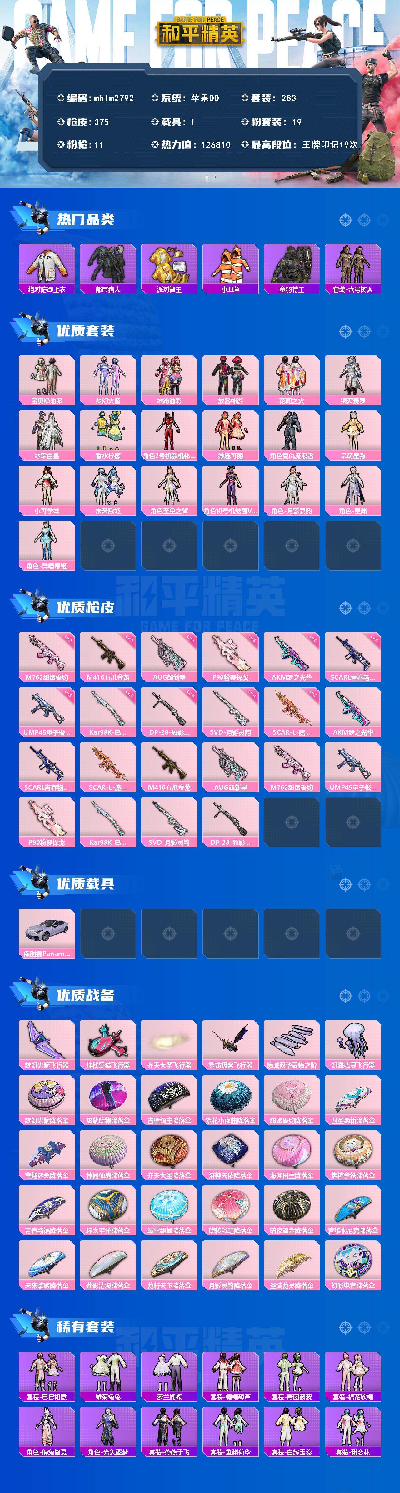 苹果 手Q-19粉装-11特效枪-1载具-8粉色飞行器-126810热力值-19王牌印记-283套装-375枪皮