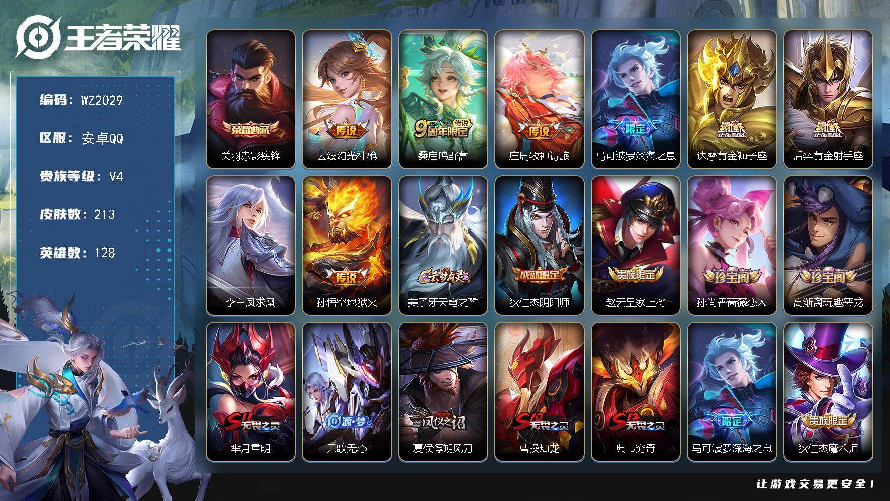 安卓Q-213皮肤-1典藏皮肤-8传说-40史诗【荣耀典藏】:关羽赤影疾锋【传说皮肤】:云缨幻光神枪,桑启鸣野蒿,庄周牧神诗旅,马可波罗深海之息,达摩黄金狮子座,后羿黄金射手座,李白凤求凰,孙悟空地狱火【限定皮肤】:姜子牙天穹之誓,狄仁杰阴阳师,赵云皇家上将,孙尚香蔷薇恋人,高渐离玩趣恶龙,芈月重明,元歌无心,夏侯惇朔风刀,曹操烛龙,典韦穷奇,马可波罗深海之息,狄仁杰魔术师,狄仁杰万华元夜,项羽海滩派对,老夫子醍醐杖,关羽冰锋战神,程咬金演武夺筹,兰陵王金庭之子,花木兰瑞麟志,牛魔御旌,李元芳云