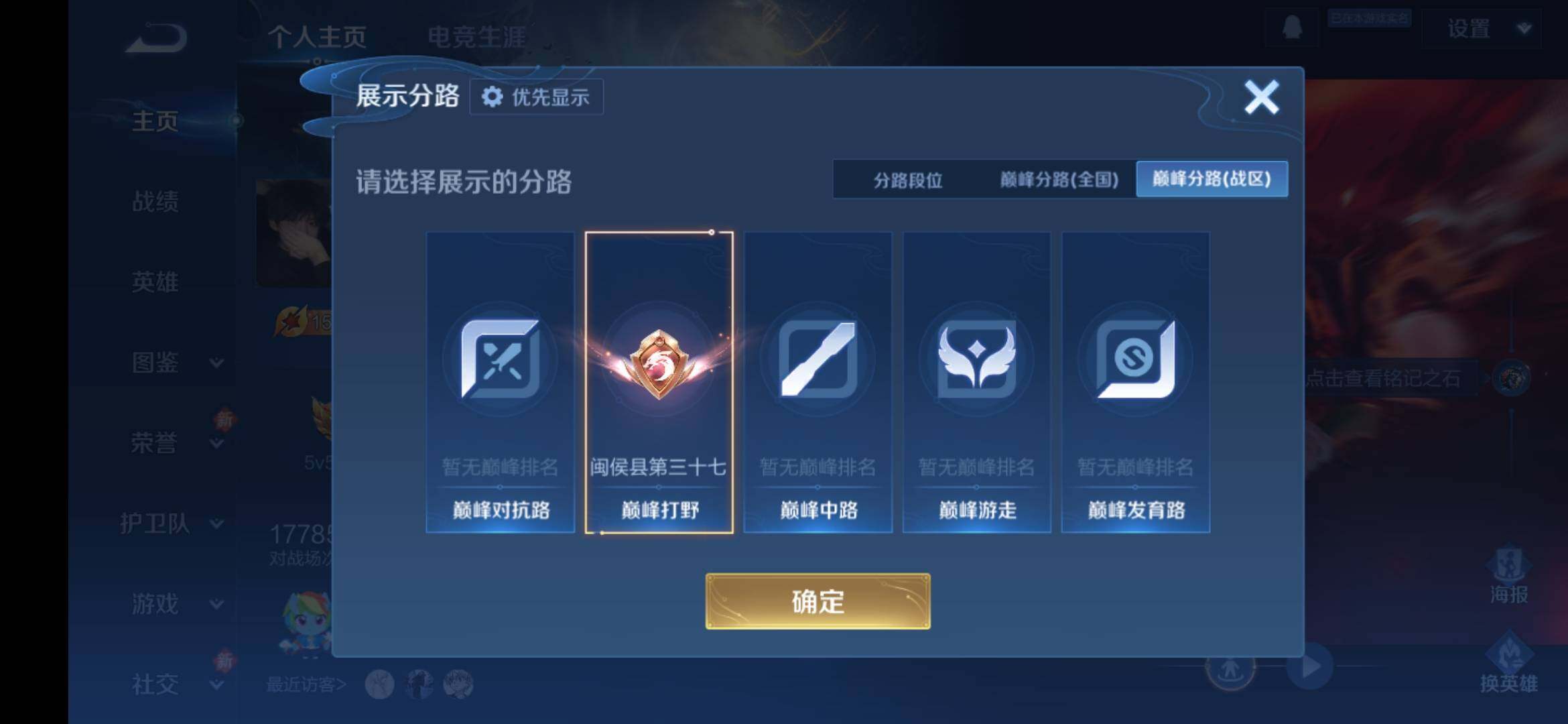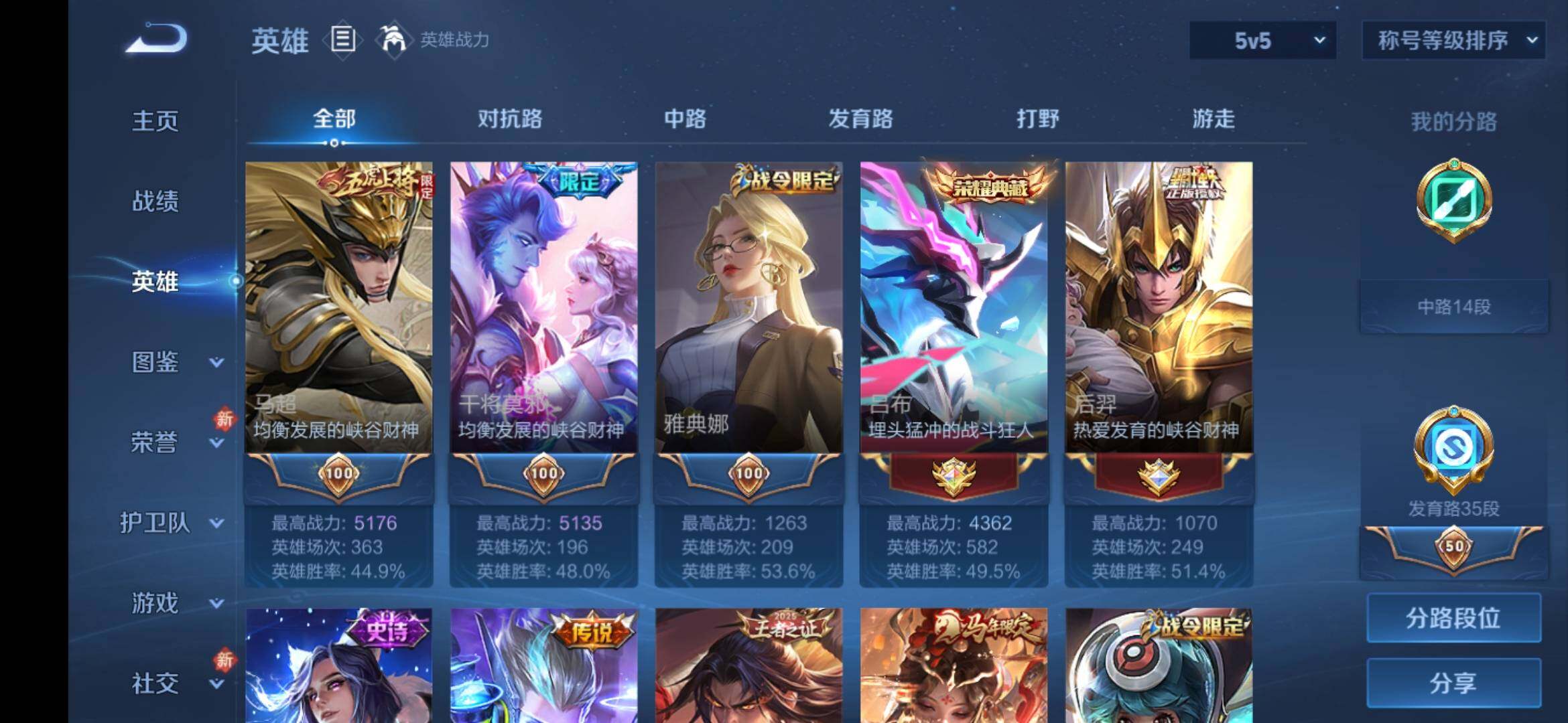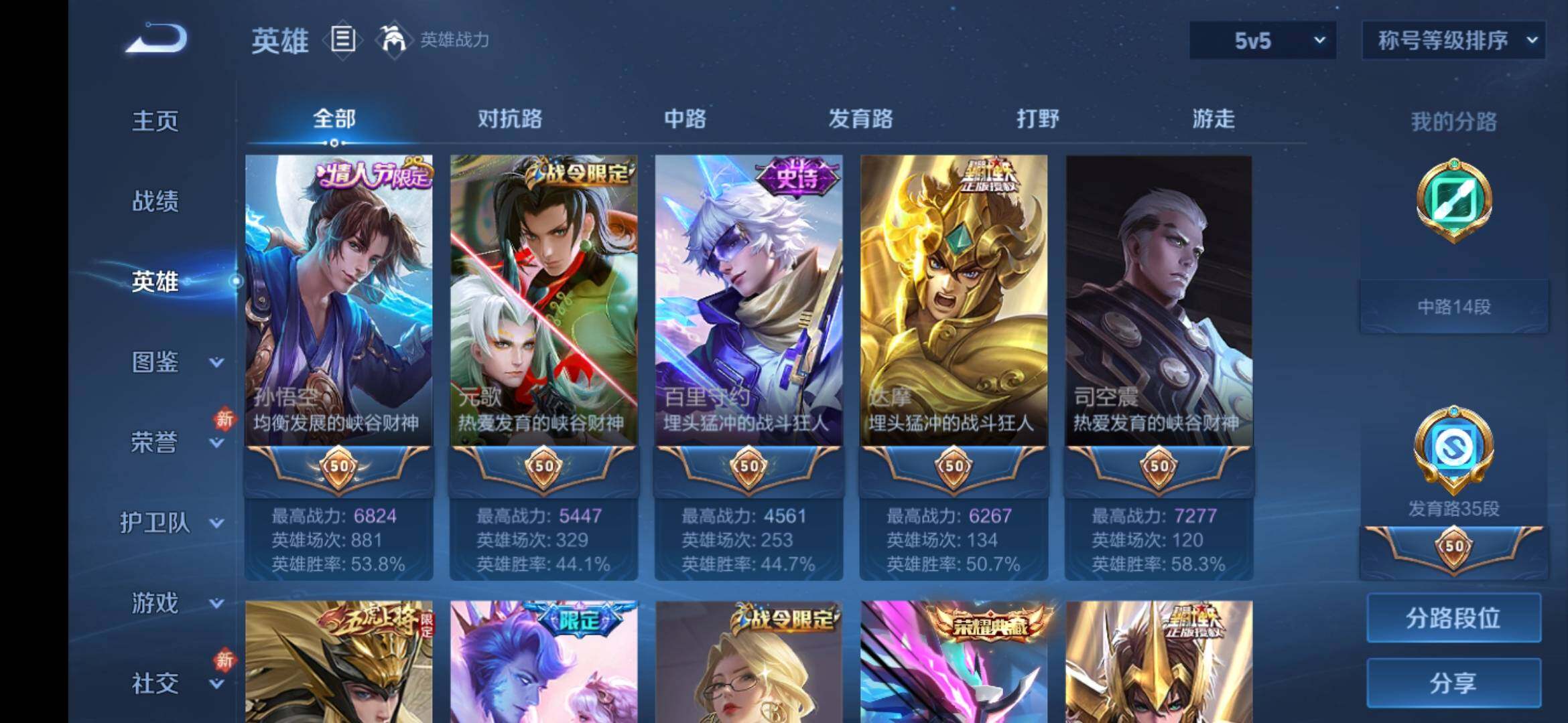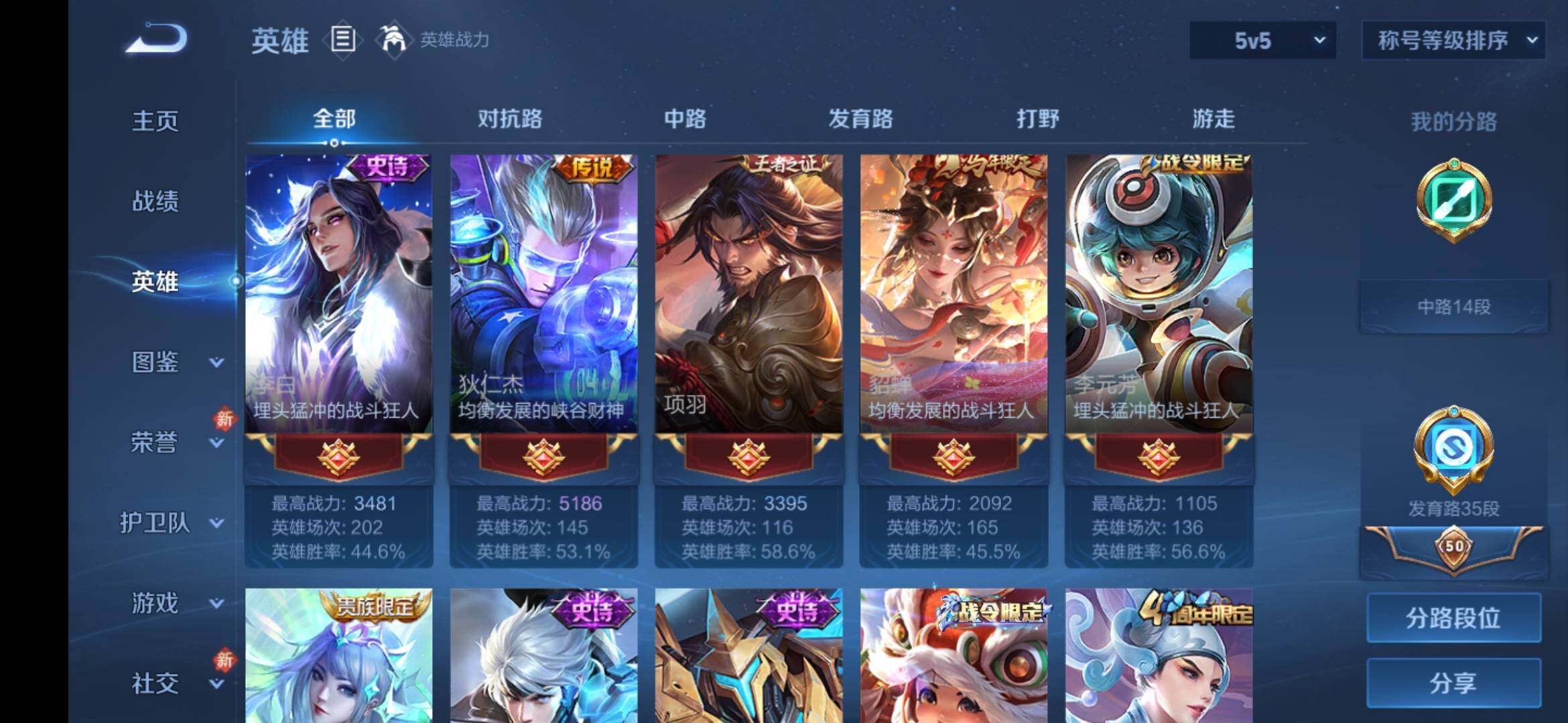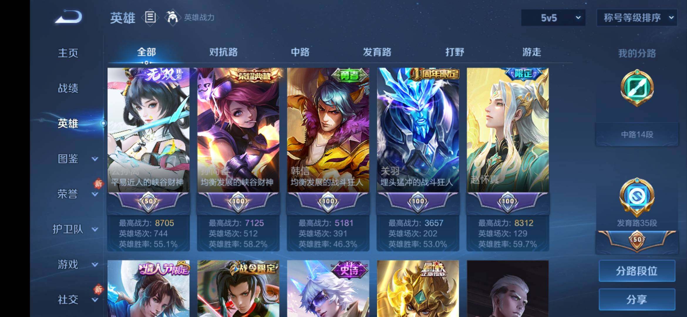 安卓Q-V9-129英雄-373皮肤-3典藏皮肤-1典藏英雄-2无双-1珍品传说-5星传说-22传说-101史诗-4金标,巅峰打野分路,发育35段,对抗32段,有至尊宝,