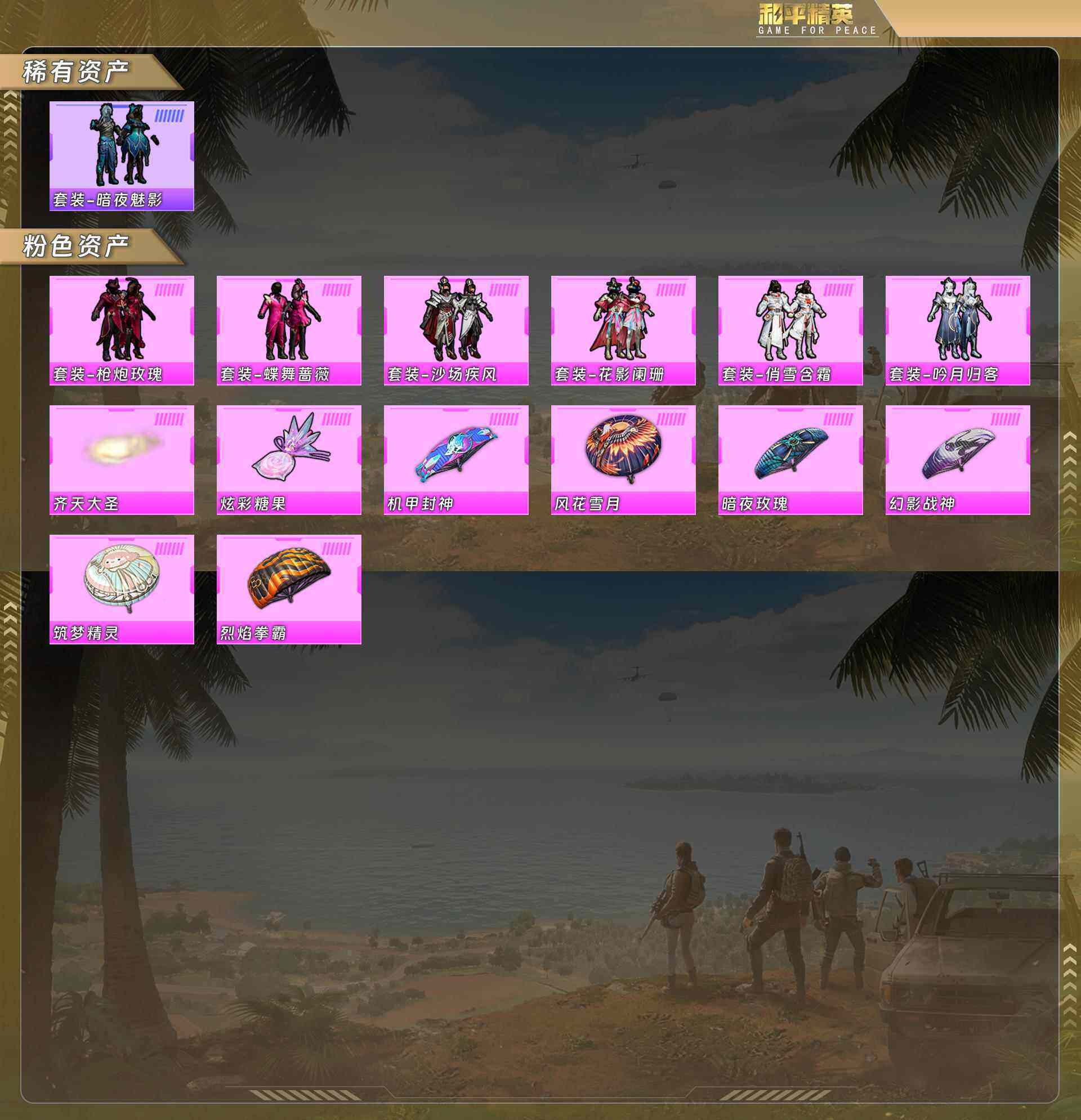 【粉色套装】:粉装-枪炮玫瑰,粉装-蝶舞蔷薇,粉装-沙场疾风,粉装-花影阑珊,粉装-俏雪含霜,粉装-吟月归客