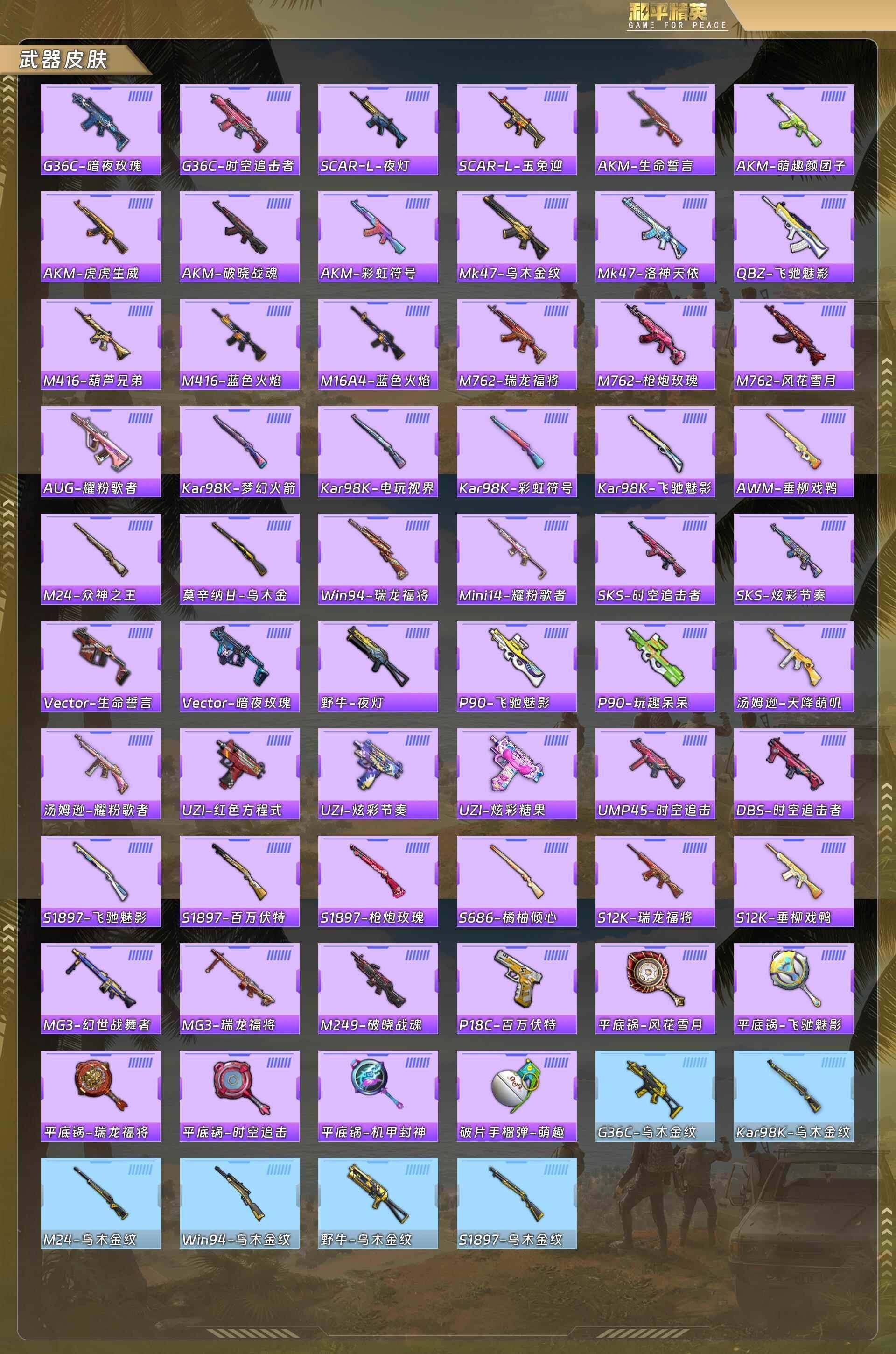 【稀有枪皮】:AKM-彩虹符号,AKM-生命誓言,AKM-破晓战魂,AKM-萌趣颜团子,AKM-虎虎生威,M16A4-蓝色火焰,SCAR-L-夜灯,