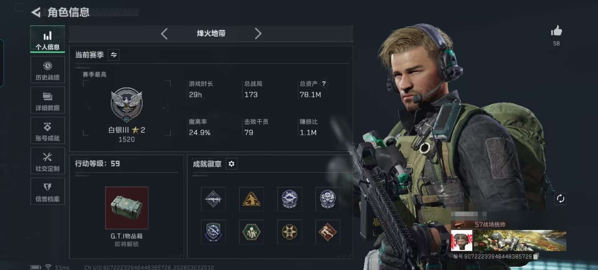 【连体号带三角洲仓库价值78.1M 哈夫币47619K 行动等级59 s8 通行