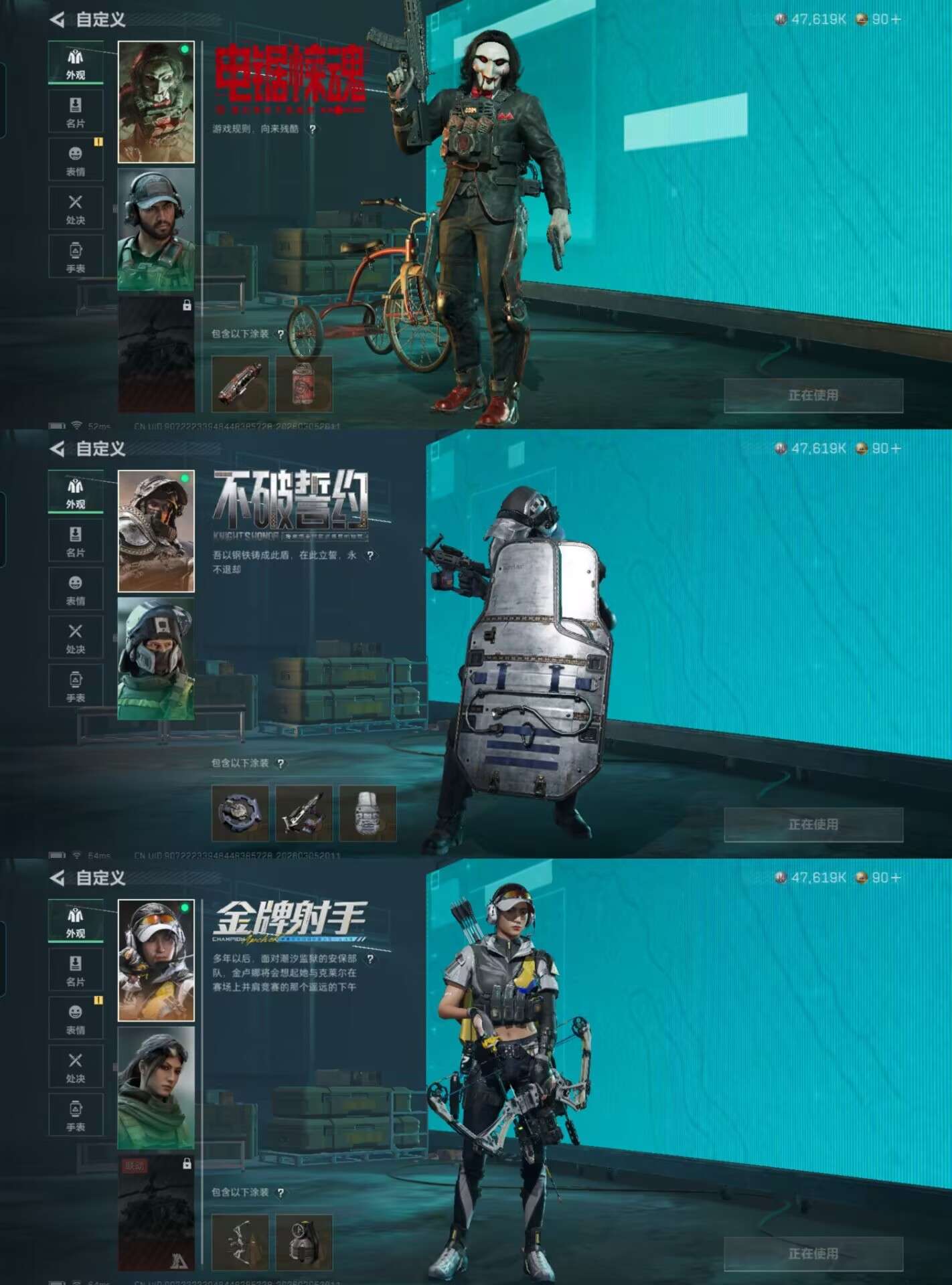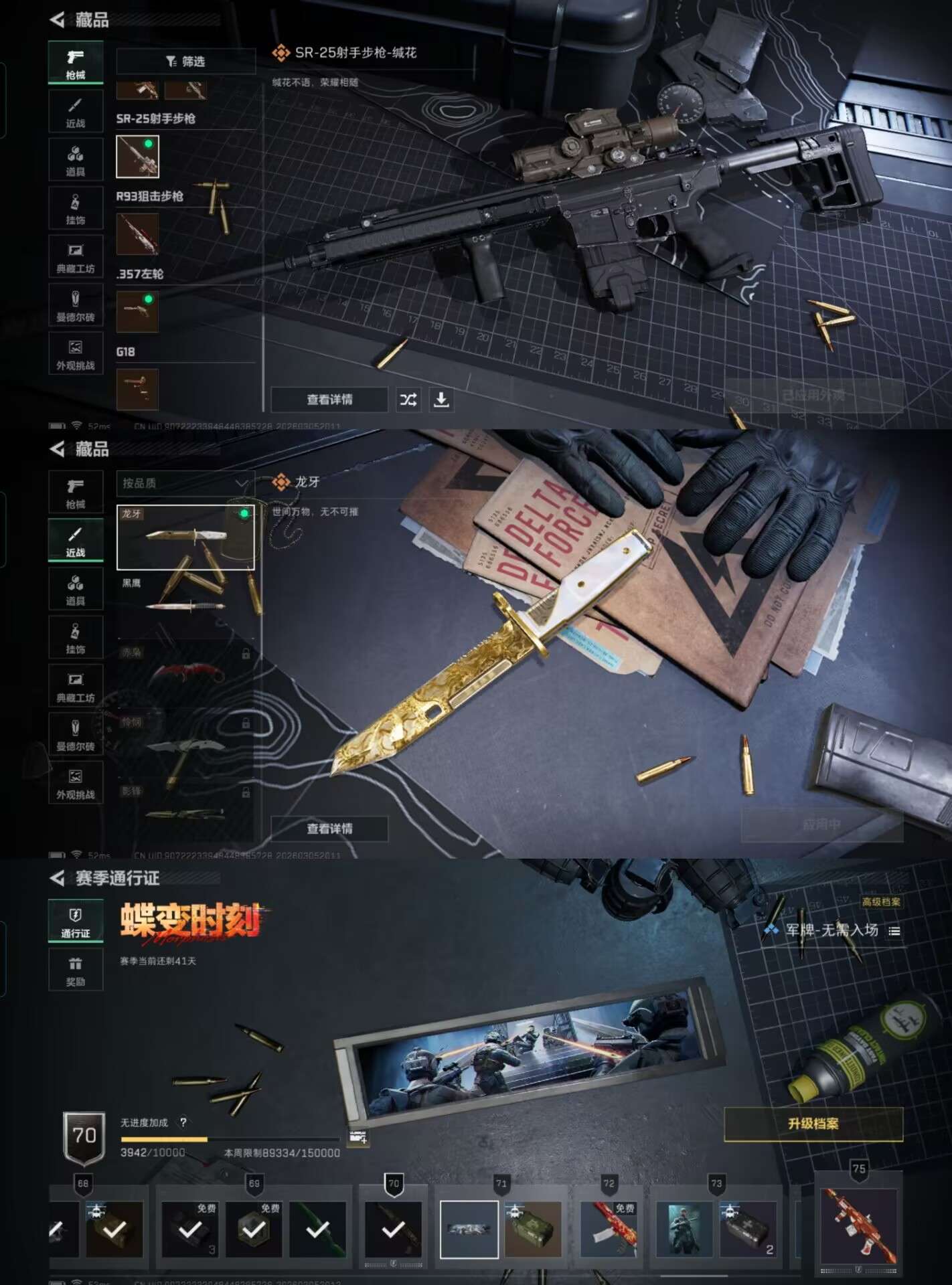 DSTW2032【连体号带三角洲仓库价值78.1M 哈夫币47619K 行动等级59 s8 通行证 4体2耐 3干员 电锯惊魂 金牌射手 不破誓约 17金枪皮 1刀 龙牙】安卓Q-等级30-仓库价值17.2M-科恩币377812-【套装】骑士典范·艾尔熙德 财团之手作战套装 和平先锋作战套装 高地武士套装 野狩骑士套装 鎏金街头套装 都市夜影套装 速度新星赛车服 公司成员套装 王国卫队礼装·轻装【近战武器】 赢家匕首 工兵铲 下弦月