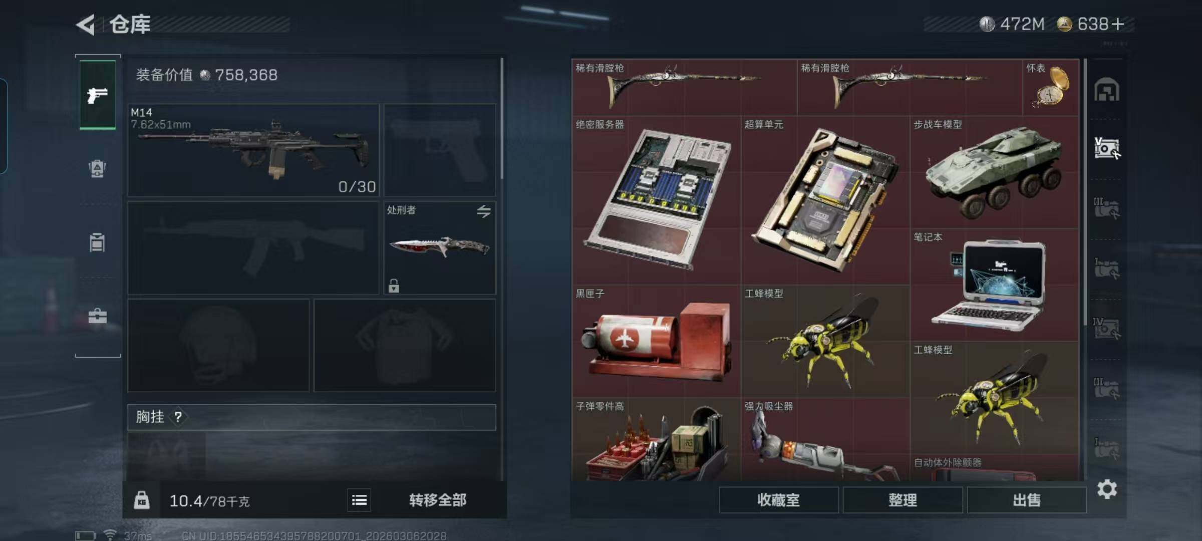 总资产(M):688M/哈夫币(K):472183K/传说枪皮数:19/全面战场等级:1_段位:无段位/烽火地带等级:60_段位:青铜/