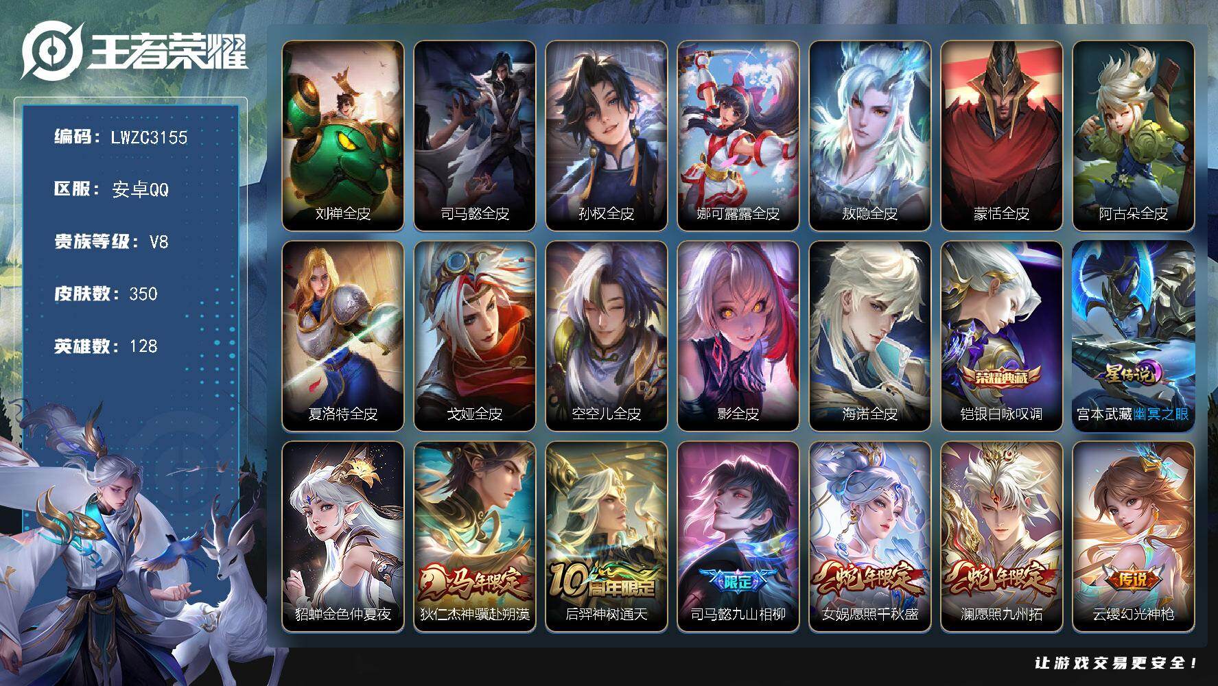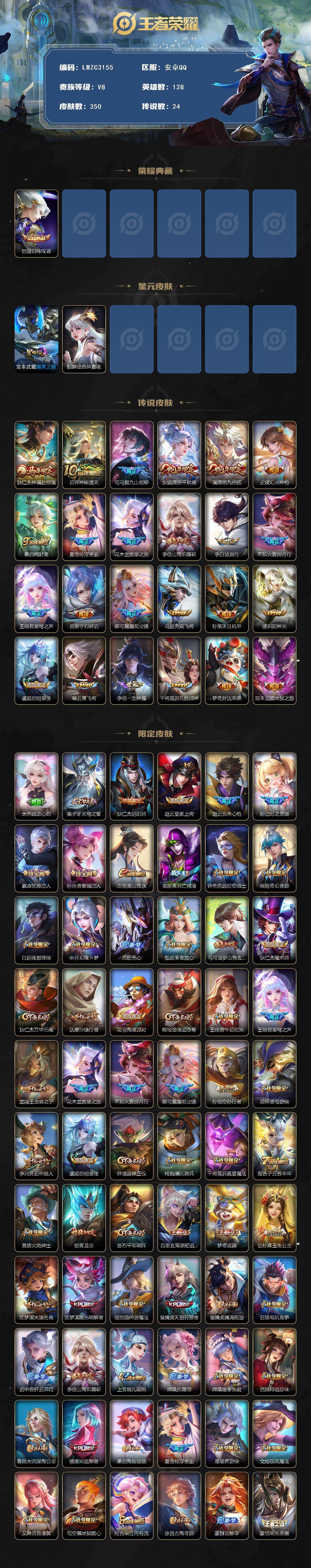 可二次【特价出售/店主推荐/2市标/30段对抗】:安卓Q-V8-最强王者段位-128英雄-350皮肤-1典藏皮肤-2星元-24传说-109史诗【英雄全皮】:刘禅全皮,司马懿全皮,孙权全皮,娜可露露全皮,敖隐全皮,蒙恬全皮,阿古朵全皮,夏洛特全皮,戈娅全皮,空空儿全皮,影全皮,海诺全皮【荣耀典藏】:铠银白咏叹调【传说皮肤】:狄仁杰神骥赴朔漠,后羿神树通天,司马懿九山相柳,女娲愿照千秋盛,澜愿照九州拓,云缨幻光神枪,桑启鸣野蒿,夏洛特浮生妄,花木兰燃星之曲,李信山海炽霜斩,李白诗剑行,不知火舞绯月行