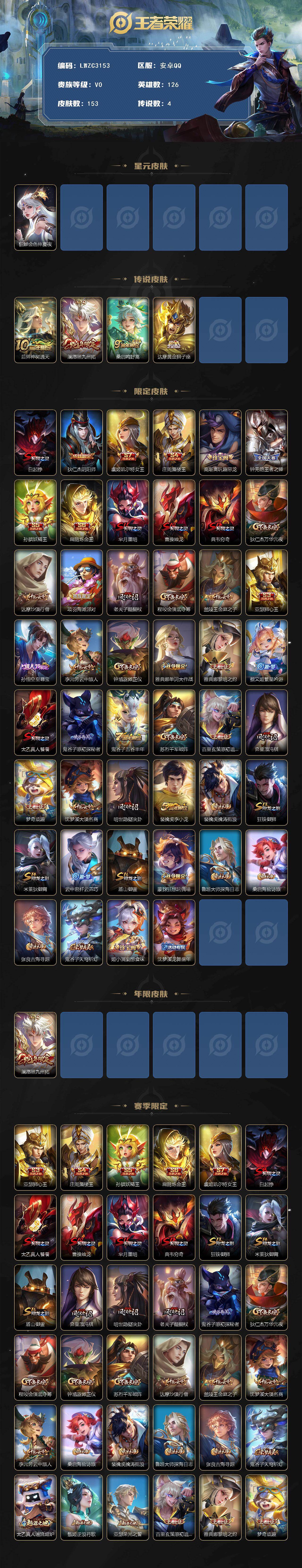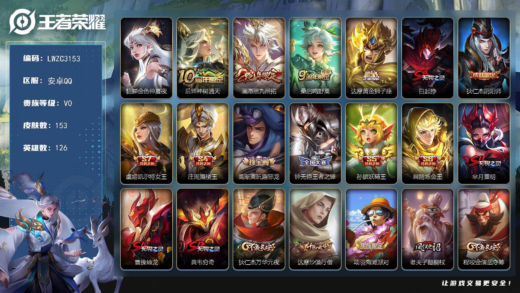 可二次【特价出售/店主推荐】:安卓Q-V0-永恒钻石IV段位-126英雄-153皮肤-4传说-1星传说-32史诗【传说皮肤】:后羿神树通天,澜愿照九州拓,桑启鸣野蒿,达摩黄金狮子座【限定皮肤】:白起狰,狄仁杰阴阳师,虞姬凯尔特女王,庄周蜃楼王,高渐离玩趣恶龙,钟无艳王者之锤,孙膑妖精王,扁鹊炼金王,芈月重明,曹操烛龙,典韦穷奇,狄仁杰万华元夜,达摩沙漠行僧,项羽海滩派对,老夫子醍醐杖,程咬金演武夺筹,兰陵王金庭之子,亚瑟狮心王,孙悟空至尊宝,李元芳云中旅人,钟馗驱傩正仪,雅典娜单词大作战,雅典娜