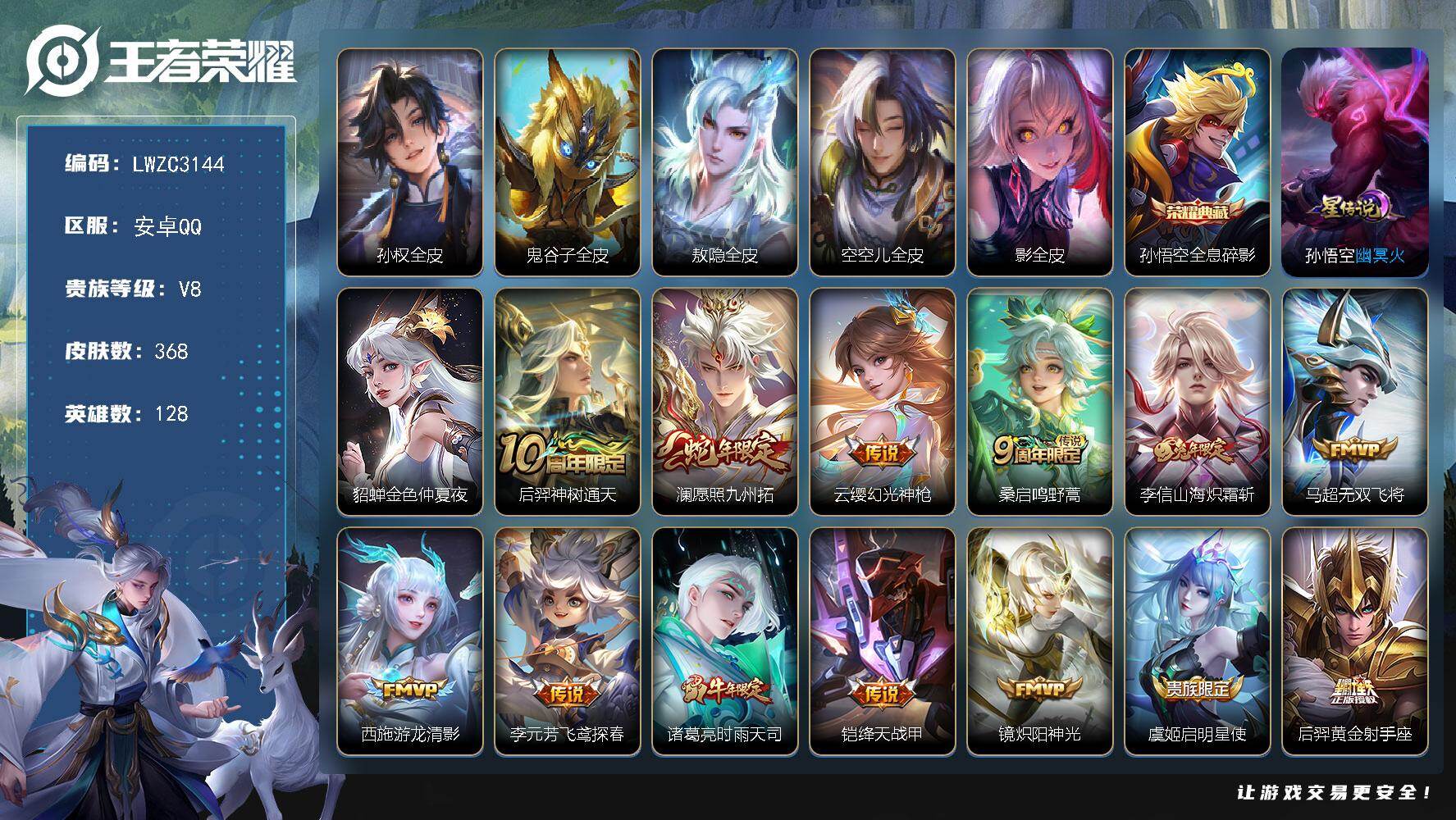 【特价出售/店主推荐】安卓Q-V8-荣耀黄金I段位-128英雄-368皮肤-1典藏皮肤-16传说-89史诗-2星元【英雄全皮】:孙权全皮,鬼谷子全皮,敖隐全皮,空空儿全皮,影全皮【荣耀典藏】:孙悟空全息碎影【传说皮肤】:后羿神树通天,澜愿照九州拓,云缨幻光神枪,桑启鸣野蒿,李信山海炽霜斩,马超无双飞将,西施游龙清影,李元芳飞鸢探春,诸葛亮时雨天司,铠绛天战甲,镜炽阳神光,虞姬启明星使,后羿黄金射手座,貂蝉仲夏夜之梦,孙悟空地狱火,狄仁杰超时空战士【限定皮肤】:大乔绒语心约,姜子牙天穹之誓,杨戬破