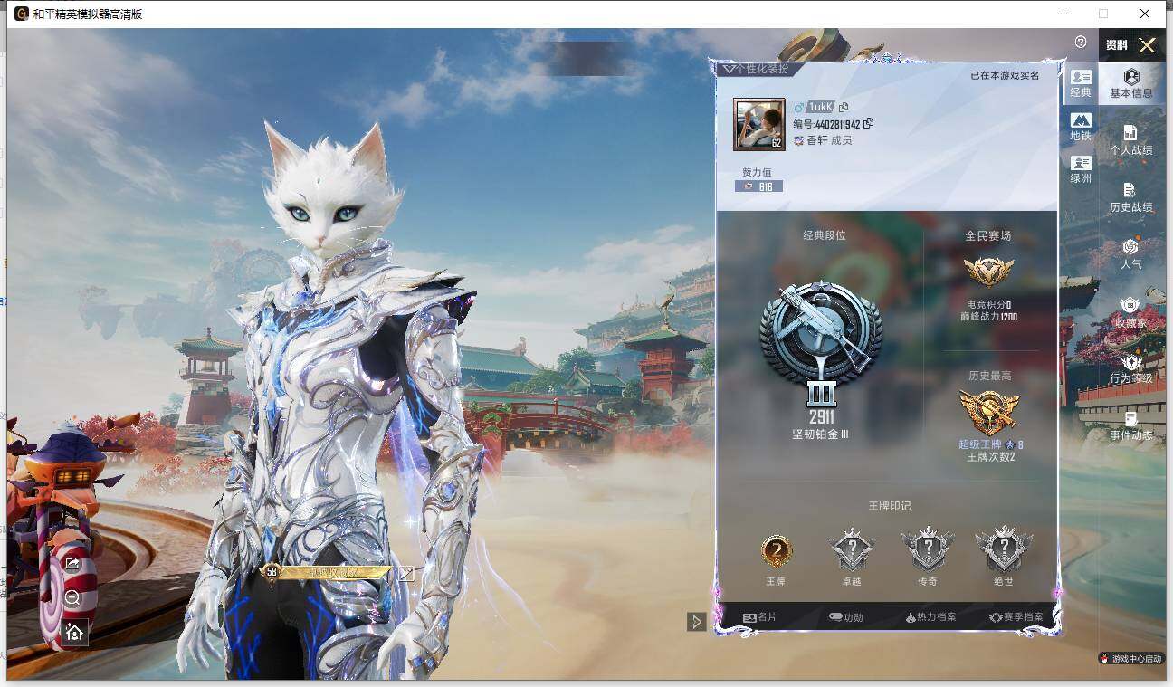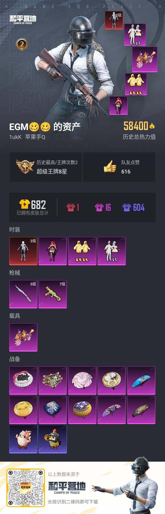 苹果 手Q-1神装-3粉装-2特效枪-1载具-0粉色飞行器-58400热力值-2王牌印记-154套装-199枪皮【红色神装等级】:灵猫魔法师-塞维尔(二级)【红色角色神装】:灵猫魔法师-塞维尔【热门品类】:套装-浪漫波比,套装-糯粉咩咩【粉色套装】:粉装-旋转彩虹,粉装-傲傲奶龙,角色-绯穹魔姬【粉色枪皮等级】:UMP45-恐龙拽拽(七级),Kar98K-巳巳如意(五级)【粉色载具】:鬼马风驰【粉色枪皮】:UMP45-恐龙拽拽,Kar98K-巳巳如意