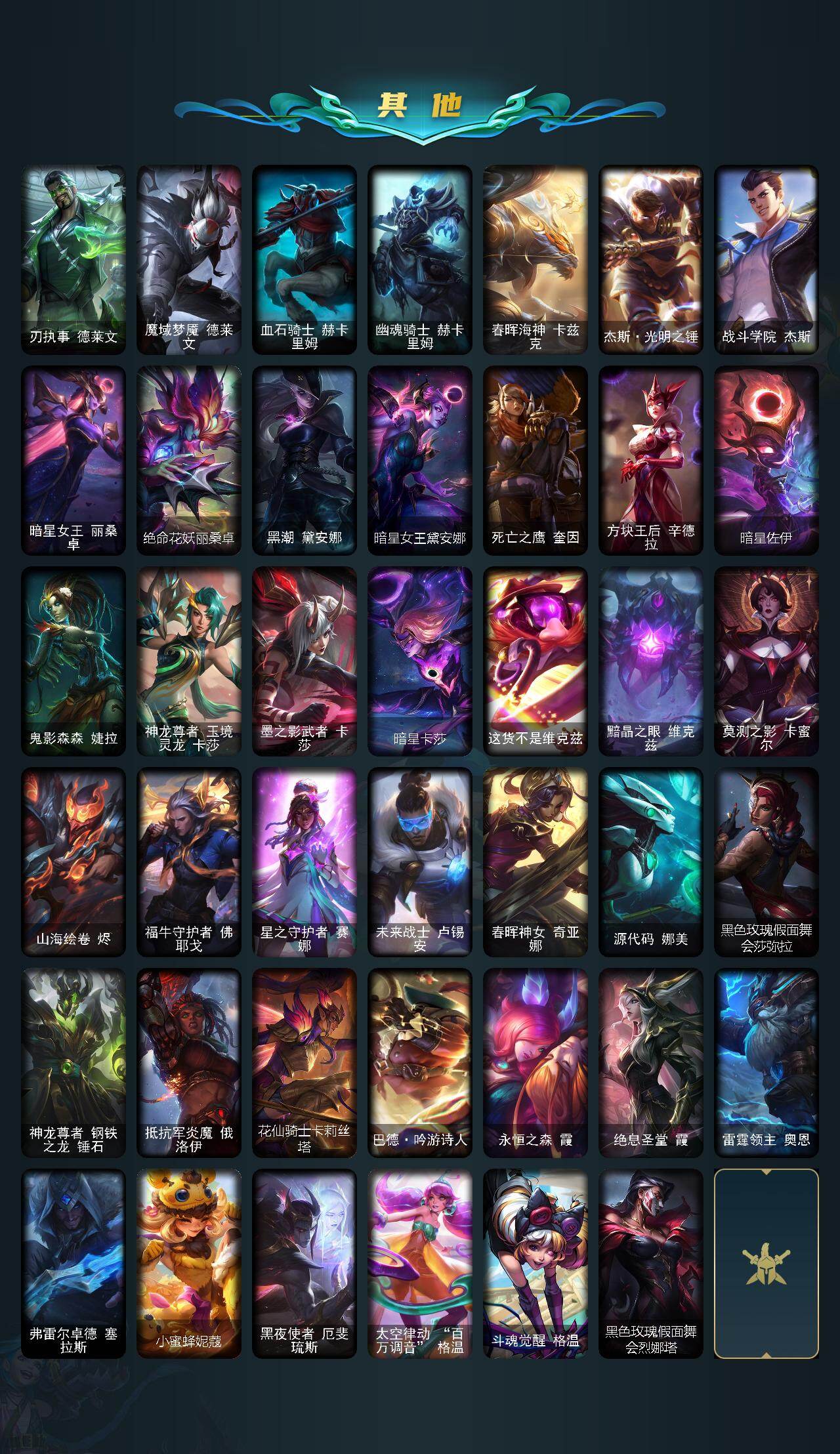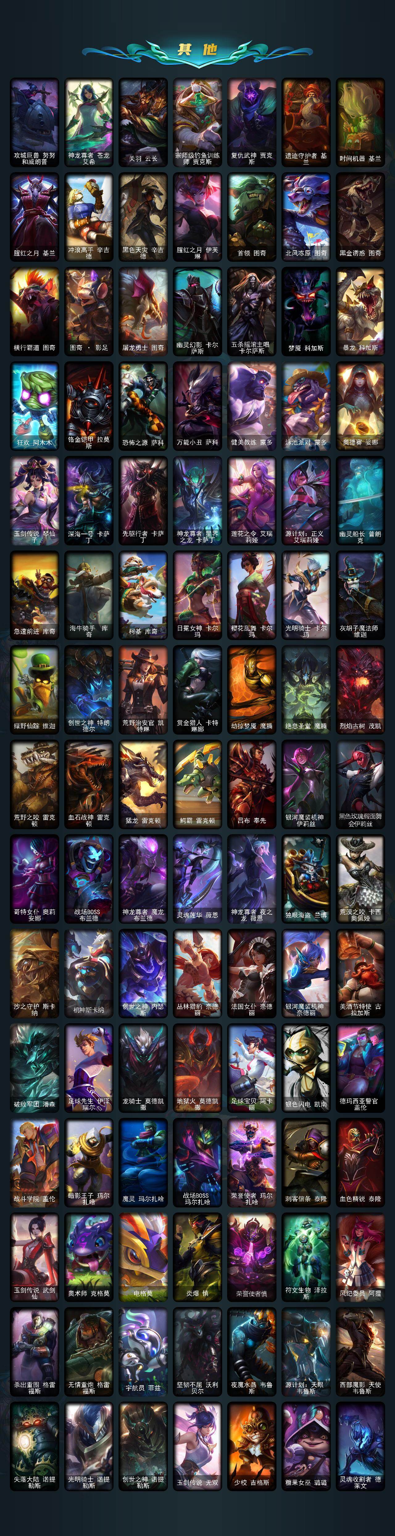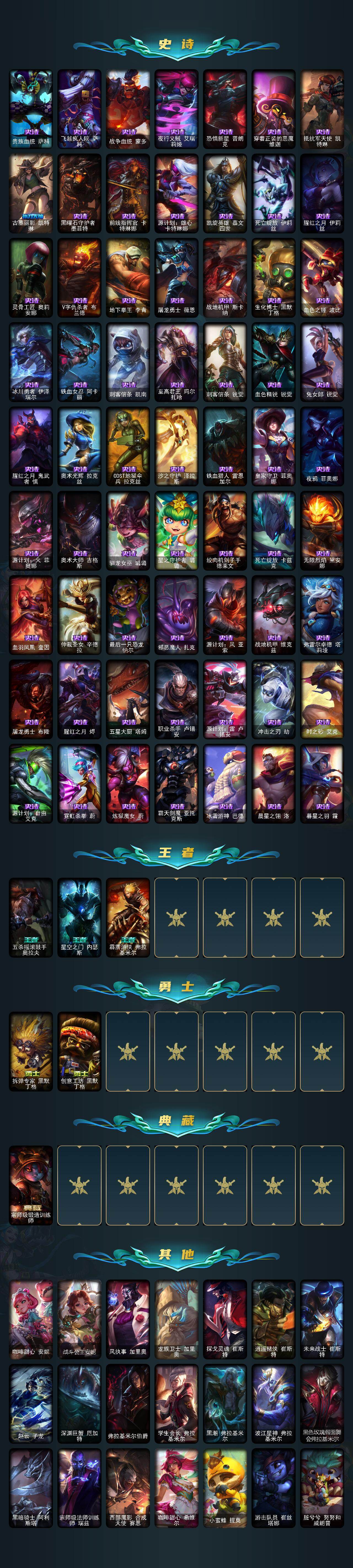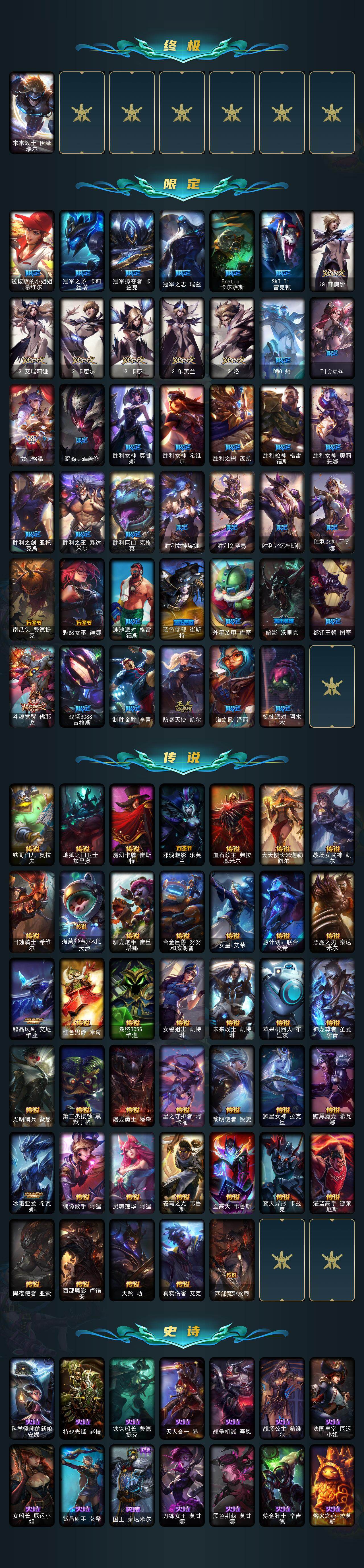 【神话皮肤】:十周年纪念安妮,源代码乐芙兰,十五周年纪念希维尔,圣天龙李青,殿堂传奇薇恩,熊猫娃娃拉克丝,水晶圣骑塔莉娅,海克斯科技嘉文四世,至臻真实伤害奇亚娜,至臻电玩女神凯特琳,至臻黑夜使者李青,至臻KDA伊芙琳,至臻烈焰美人薇恩,至臻魅惑女巫厄运小姐,至臻魔女阿卡丽,至臻魔女乐芙兰,至臻未来战士卢锡安,至臻源计划正义艾瑞莉娅,至臻玉剑传说武剑仙