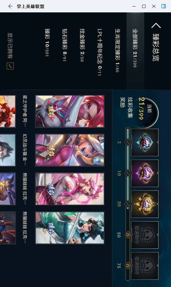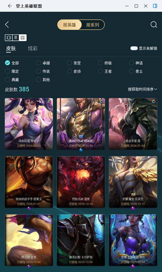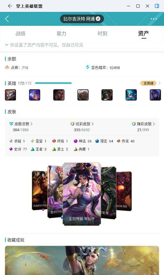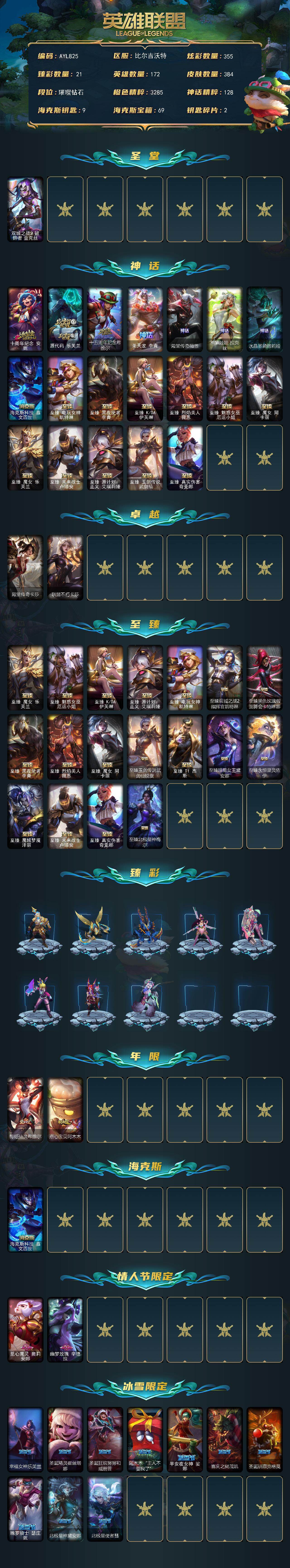 钻石段位-172英雄-384皮肤-355炫彩-1终极-26神话-64限定-40传说-77史诗