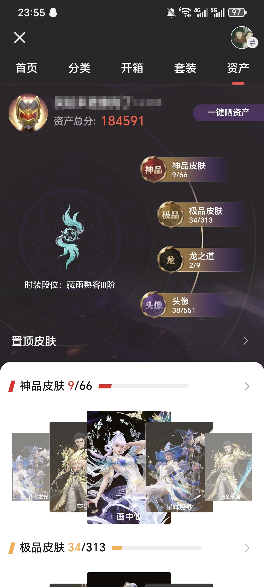 【游戏等级】203【大区】国服【排位】黄金Ⅴ【神品皮肤】画中仙 星辉魔纱 流金晓锦 苍穹之光 帝星 飞将戟 凌霄之羽 狂龙 蝶梦