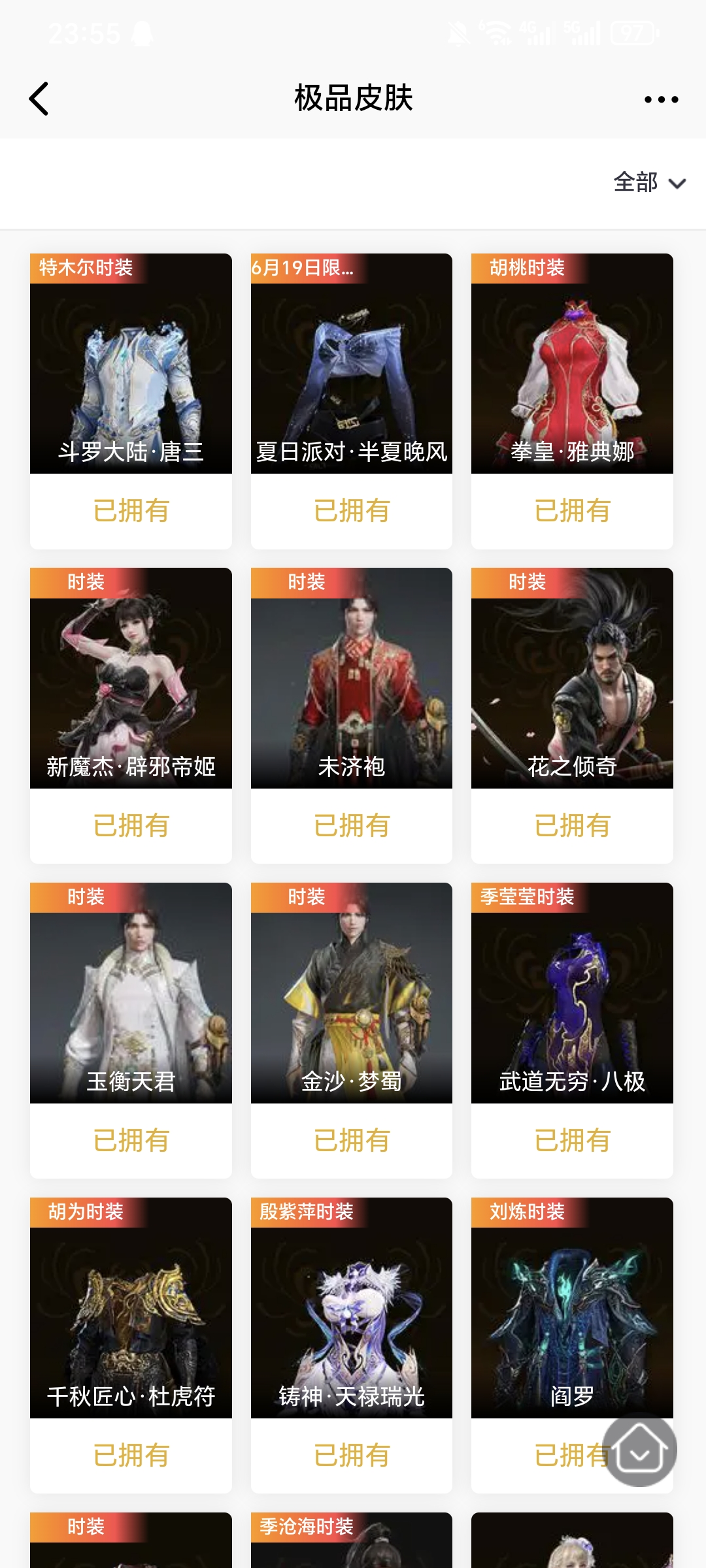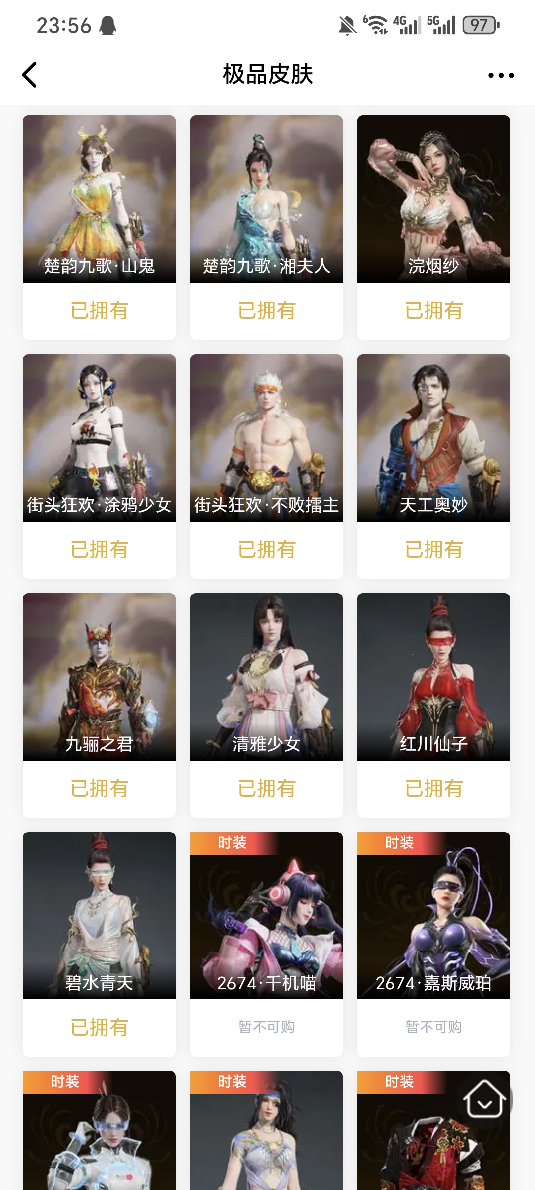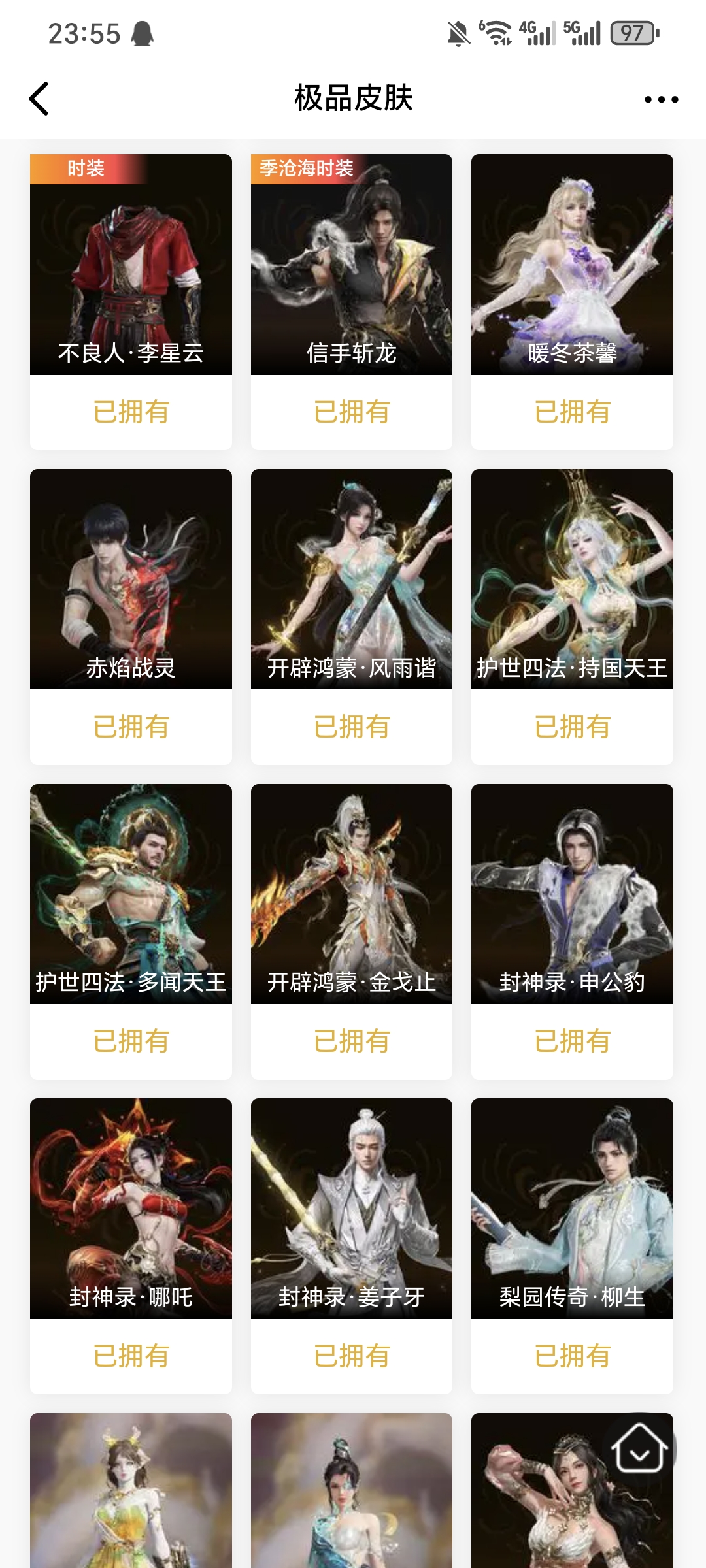 【极品皮肤】暖冬茶馨 赤焰战灵 开辟鸿蒙·风雨谐 开辟鸿蒙·金戈止 护世四法·持国天王 护世四法·多闻天王 封神录·申公豹 封神录·哪吒 封神录·姜子牙 梨园传奇·柳生 楚韵九歌·山鬼 楚韵九歌·湘夫人 浣烟纱 街头狂欢·涂鸦少女 街头狂欢·不败擂主
